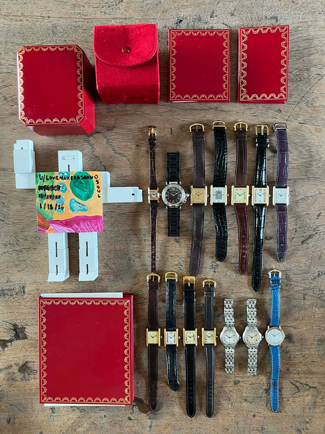 **Hello WatchExchange,** I'm back today to offer you a new haul of (mostly) vintage Cartier's. The holidays were good to me on Chrono24, but it's back to Reddit! As always, every watch shown will be keeping accurate time- checked and tested by yours truly. Battery swaps were made prior to the listing using Renata batteries wherever applicable. This time, we have 3 manual winding tank's, all from the 80's. The midsized trinity MW tank was completely overhauled last month by a professional watchmaker while the other two smaller MW tanks did not need overhauling and are keeping very accurate time. More specific information available in the details.  **For reference, I am a 7" wrist.** **Please note that the lighting used to photograph these watches was intentionally chosen to highlight the wear and does not reflect how the watches will look on wrist. The watches will typically look much better in softer lighting.** As always, I will be as transparent and straightforward as possible with potential buyers. If you have any questions, please feel free to message me. I'm always happy to chat! For references, please message. [**Group Timestamp**](https://imgur.com/a/u-lovemakesasoundsoul-r-watchexchange-1-18-26-sTadVC6)