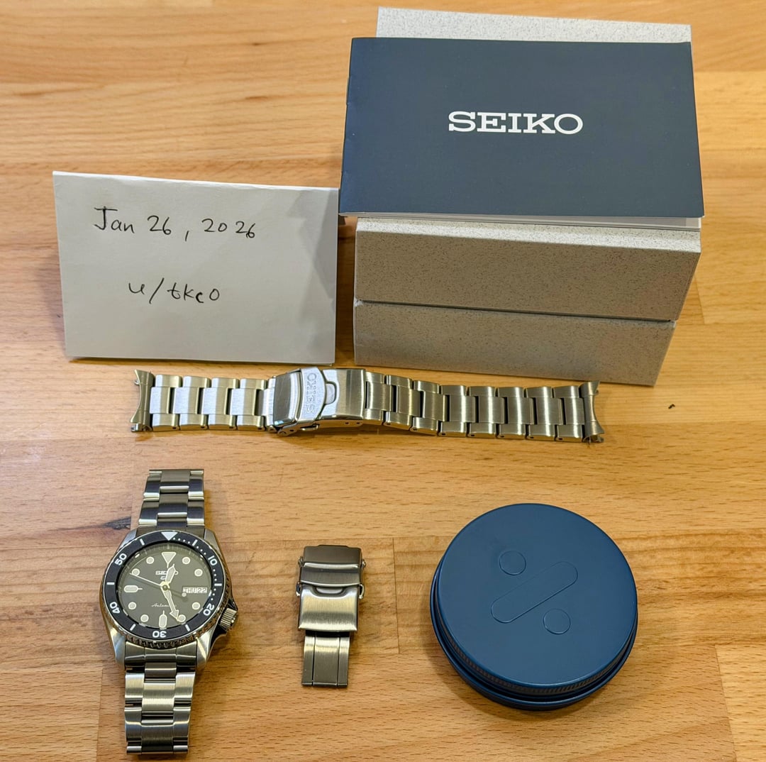 **Watch:** Seiko SRPK29 (Seiko 5 Sports SKX Mid-Size) **Condition:** Excellent. Minimal wear and tear from light use. Crystal is perfect - no scratches or marks whatsoever. **What's Included:** * Seiko SRPK29 watch * Original box * All mods listed below **Why This Setup is Special:** The SRPK29 is already one of the best-wearing modern Seikos thanks to its vintage-inspired 38mm size. These mods take it to the next level: 1. Namoki Mods Slim Caseback - Shaves \~1mm off the thickness, bringing it from 12.1mm down to approximately 11mm. Combined with the 38mm case, this thing wears like a dream. 2. Islander Solid End-Links Bracelet - Quality brushed stainless steel with solid end links. Tapers from 20mm at the lugs to 16mm at the clasp for a sleek, balanced look. 3. Fly Adjust Clasp - Tool-free micro-adjustments on the fly. Perfect for daily comfort. **Specs:** * Movement: Seiko 4R36 Automatic (hacking, hand-winding, 41hr power reserve) * Case: 38mm diameter, \~11mm thick (with slim caseback) * Lug-to-Lug: 44.2mm * Water Resistance: 100m * Crystal: Hardlex * Lug Width: 20mm **Price:** $250 USD shipped CONUS (PayPal F&F) Open to reasonable offers. No trades at this time. Happy to answer questions or send additional photos!