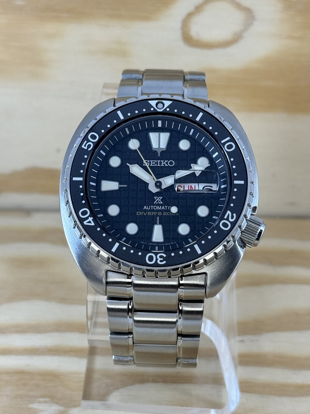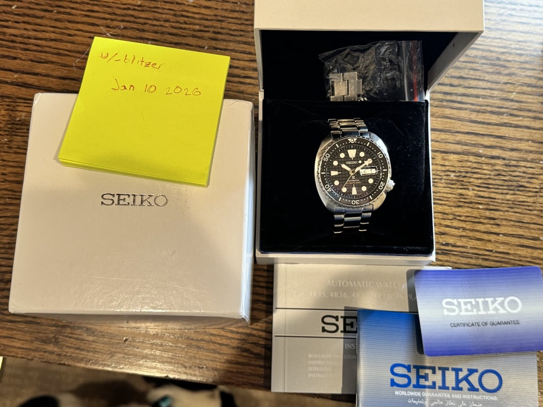 Hello WatchEx! One of the great affordable modern seiko divers here - looking for a new home. Great way to jumpstart your collection, grab a solid daily wearer. This thing is a strap monster. **Asking $320 - US shipping included. Happy to ship internationally. Not looking for trades right now.** I took this king turtle in on trade for a custom build, and it's overlapping a bit too much with the other divers i have in rotation, so... needs a new home! It comes complete with the box, papers, unsigned warranty card, and all links. I \*think\* all of the pins and pipes are there too, but YMMV. I've checked the movement on my timegrapher, it's keeping time well within seiko spec. Watch is in good condition overall - a few desk diving marks here and there, scratch or two on the caseback, but no major gouges. Crystal and insert are clear. bezel / chapter / dial alignment is good. [Album](https://imgur.com/a/seiko-king-turtle-srpe03-jXNIreZ) | [Timestamp](https://imgur.com/ZgsivAX) **Specs** * 45 x 47.5mm stainless steel case, 22mm lugs. 13.2mm thick including cyclops * Screw-down crown, 200m WR * 22mm bracelet with diver's fliplock micro-adjust clasp * Sapphire crystal with day-date cyclops, inner AR coating * 120-click unidirectional bezel with ceramic bezel insert and lumed pip * Black dial with waffle texture and Seiko's Lumibrite green lume * Matching brushed silver handset with Lumibrite green lume * 4r36 automatic movement - 21,600 BPH (3hz) - hacks and handwinds. Quickset day and date functions * Solid diver's caseback