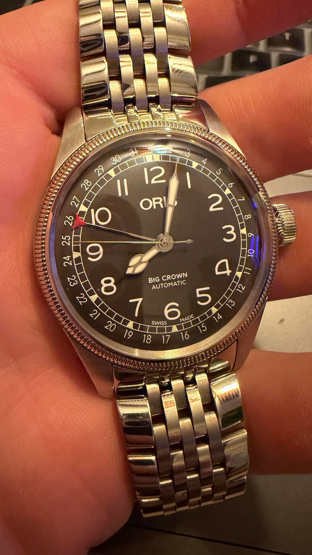 Oris Big crown pointer date 40mm Great condition (see pics) more available on request No real marks worth mentioning unless you are looking at it with a magnifying glass 🔎 Worn it, adjusted links, comes with full set. Runs great With blue recyclable box Oris cloth & tag 900 shipped CONUS PP FF or Zelle Tons of references elsewhere on Reddit- I'm the head moderator of /r/knife_swap and have HUGE amounts of feedback there for similarly priced items. Happy to answer any questions, this is my first time posting to sell on WX.