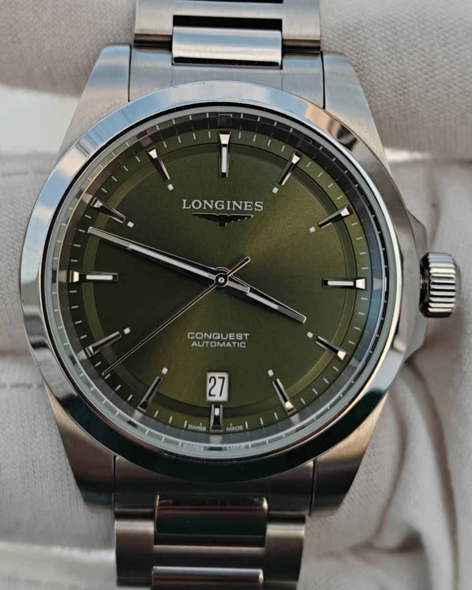 # Longines. Conquest 38. Sunray Green. 2025 Full Kit. L3.720.4.02.6 Dial: Sunray Green Movement: Automatic Caliber L888 Condition: Good condition (8.5/10) - All Functions work well - Runs good Bracelet: Comes with full links original bracelet Price: $1349 plus ship Comes Full kit - 2025 Warranty - many more years! Follow me on Instagram and Reddit for free insured shipping: Instagram: [https://www.instagram.com/thelastsecondbyom](https://www.instagram.com/thelastsecondbyom) Thank you