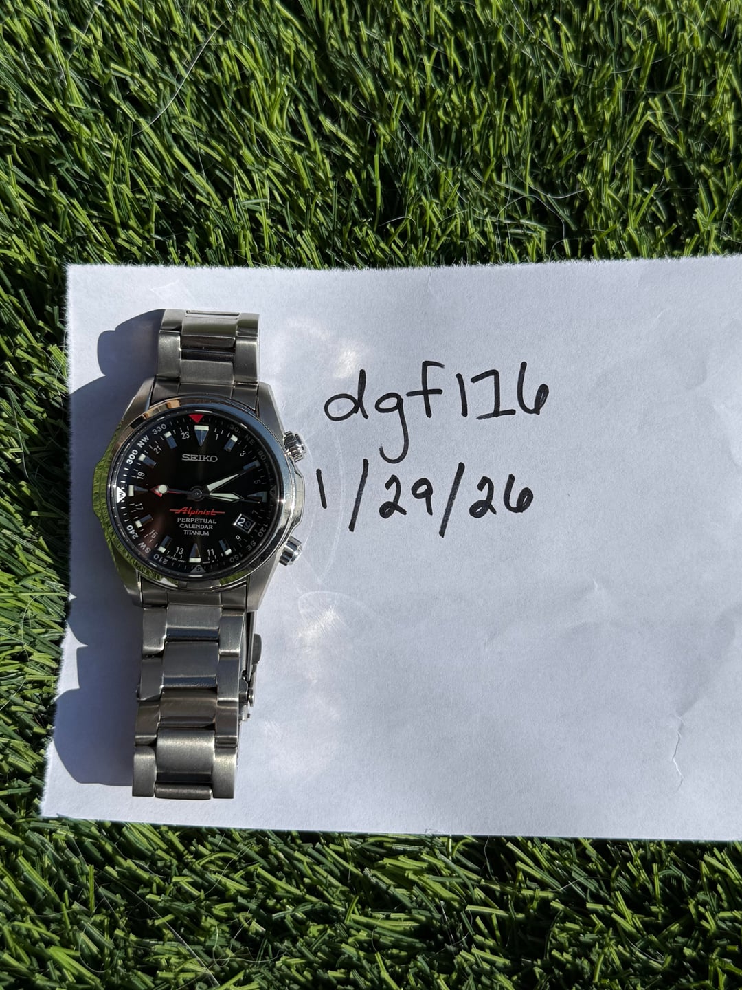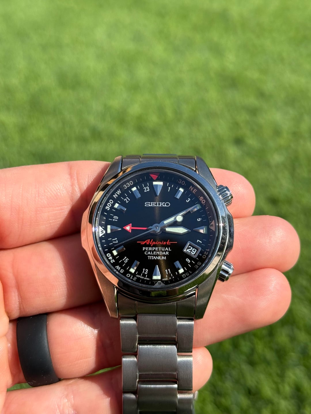 Up for sale is my Seiko Alpinist SBCJ019, powered by the legendary Seiko 8F56 perpetual calendar GMT quartz movement. This model is discontinued and part of the earlier Alpinist lineup that combined tool-watch functionality with a lightweight titanium case and bracelet and an internal rotating compass bezel. The 8F56 is known for its high accuracy and true perpetual calendar that automatically adjusts for leap years, with a jumping date at midnight and independent GMT hand. This is in excellent condition with clean crystal, sharp case lines, and only minimal wear consistent with careful use. Watch only. Bracelet fits approximately a 7”-7.25” wrist. No extra links included. Asking $1050 obo shipped & insured. PayPal FF or GS (add fee), Venmo, Zelle. Timestamp and additional pictures: https://imgur.com/a/YHrNB4e Please reach out with any questions, additional pictures or anything else you may need. Thanks!