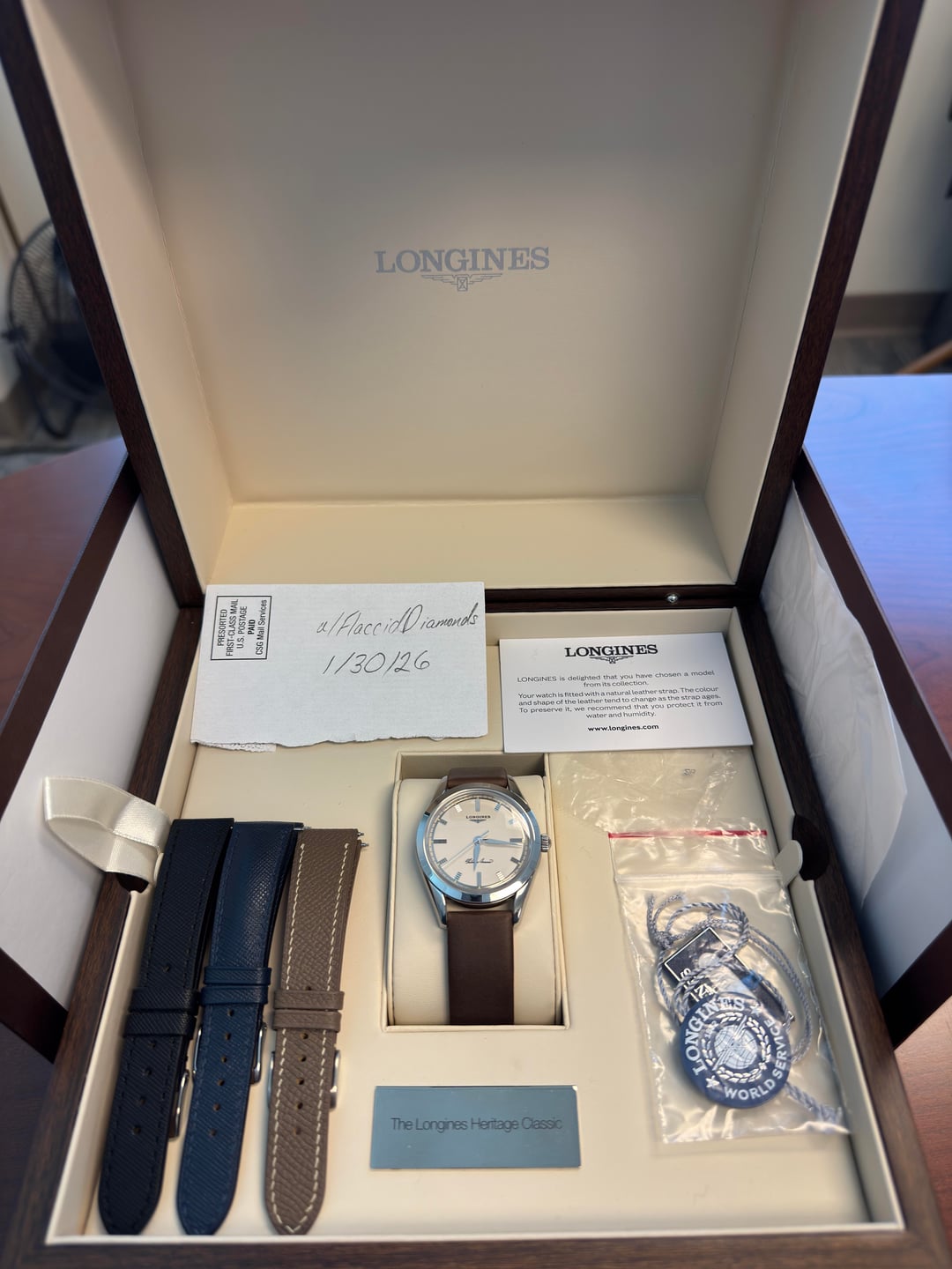 Timestamp, video, and photos of the full kit: https://imgur.com/a/0iPXht4 Reference: L2.834.4.72.2 Case: Stainless steel 38.5 mm diameter, 9.90mm thick Crystal: Box-style sapphire crystal with anti-reflective coating Dial: Cream with striated applied indices and Dauphine-style hands with Super-LumiNova Movement: Automatic Longines Caliber L888.5, Swiss made, 21 jewels, 25,200 bph Power Reserve: Approximately 72 hours Functions: Hours, minutes, seconds. Water Straps: Brown Longines calfskin leather with stainless steel tang buckle, Delugs Blue and Grey leather, and one Saffiano black leather strap. NOTE: the adhesive on one of the two keepers has failed and detached from the strap, but it will be included with the sale. Condition: the watch has minor wear on the case, unnoticeable unless closely inspected. Gorgeous watch. Kit includes a beautiful Longines wooden box with full kit. Asking 1250 shipped CONUS, willing to ship elsewhere at buyer’s expense. No trades unless it’s a spring drive GS.