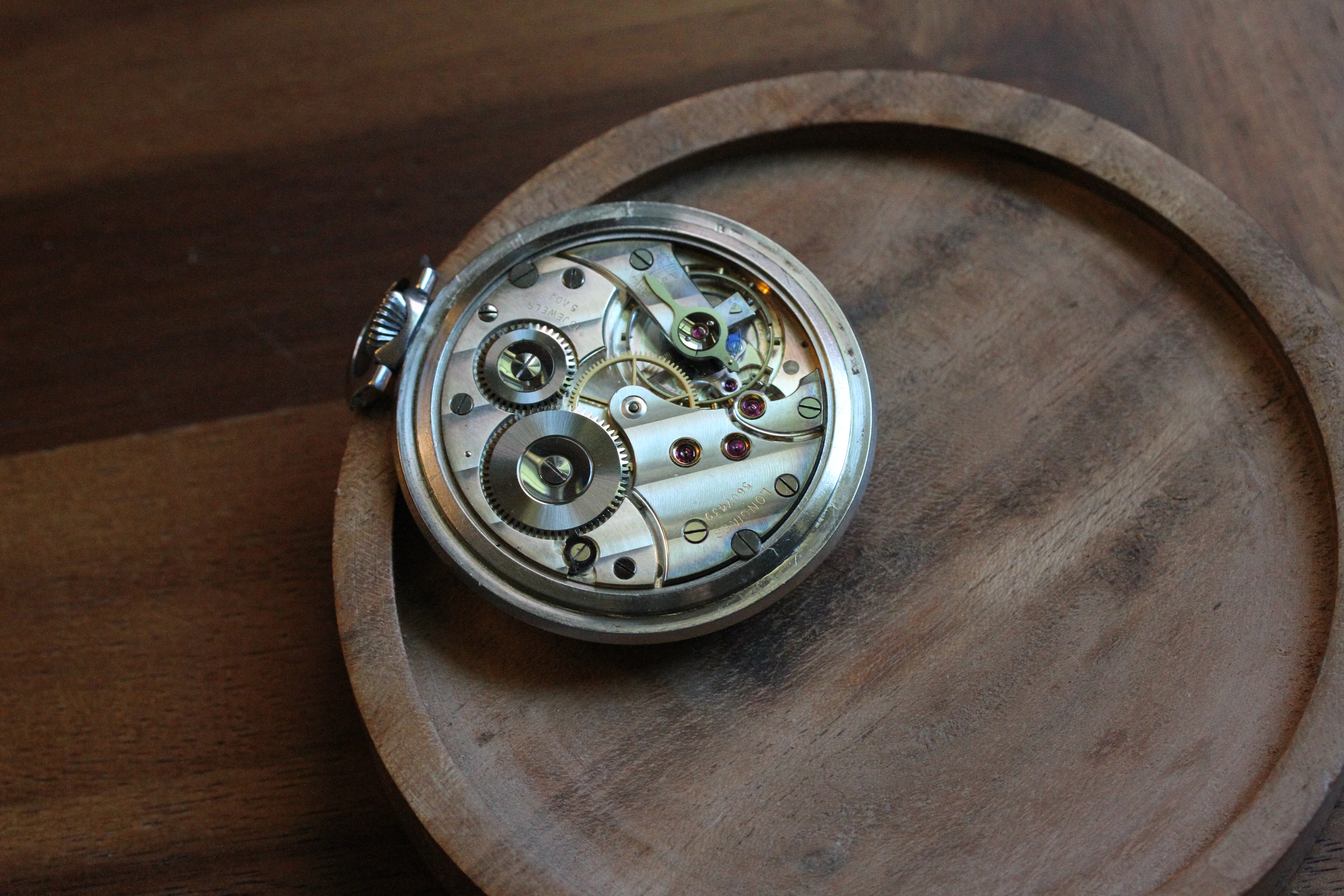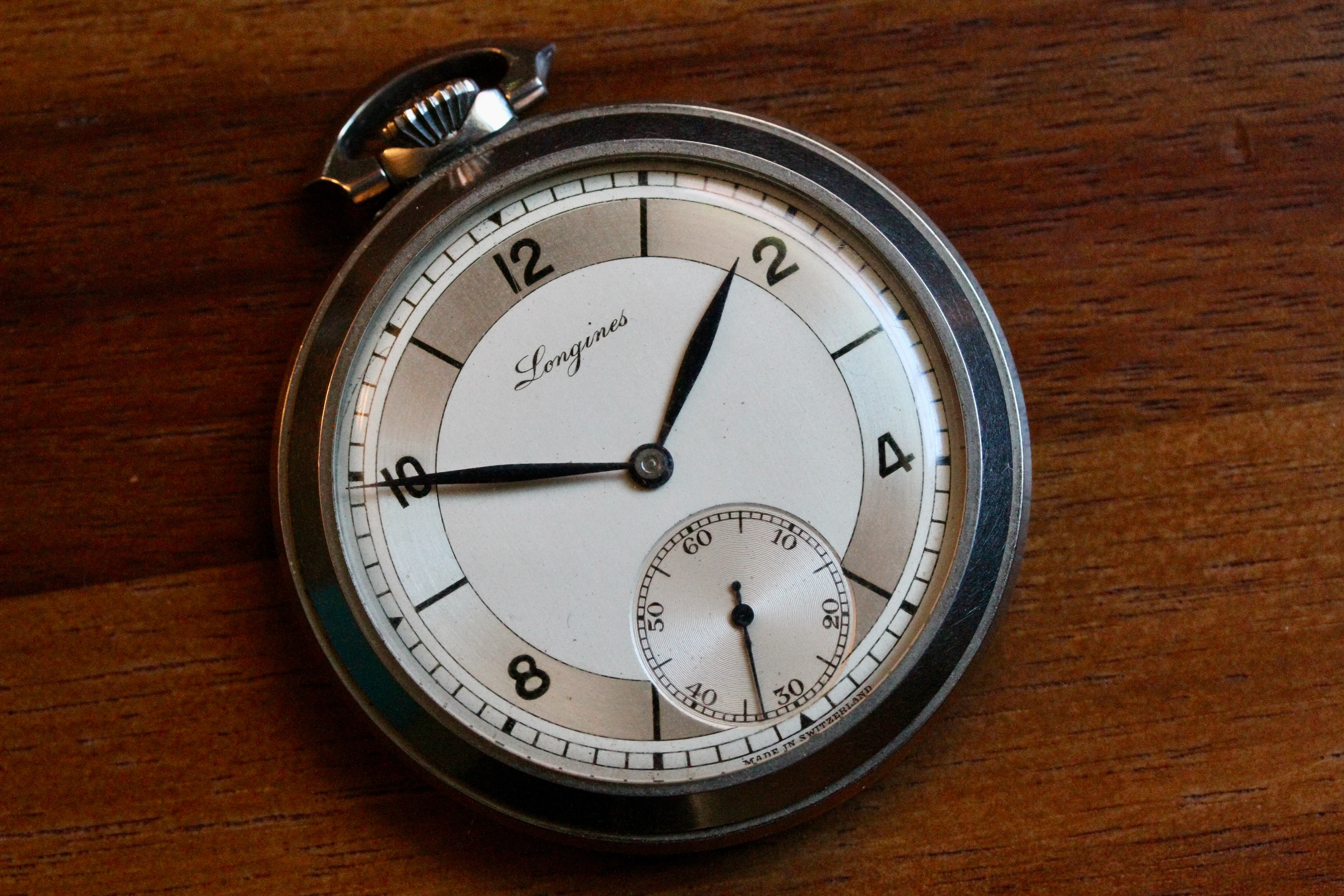 Two-tone Longines pocket watch, caliber 37.9, stainless steel, 1937, Five Times Adjusted