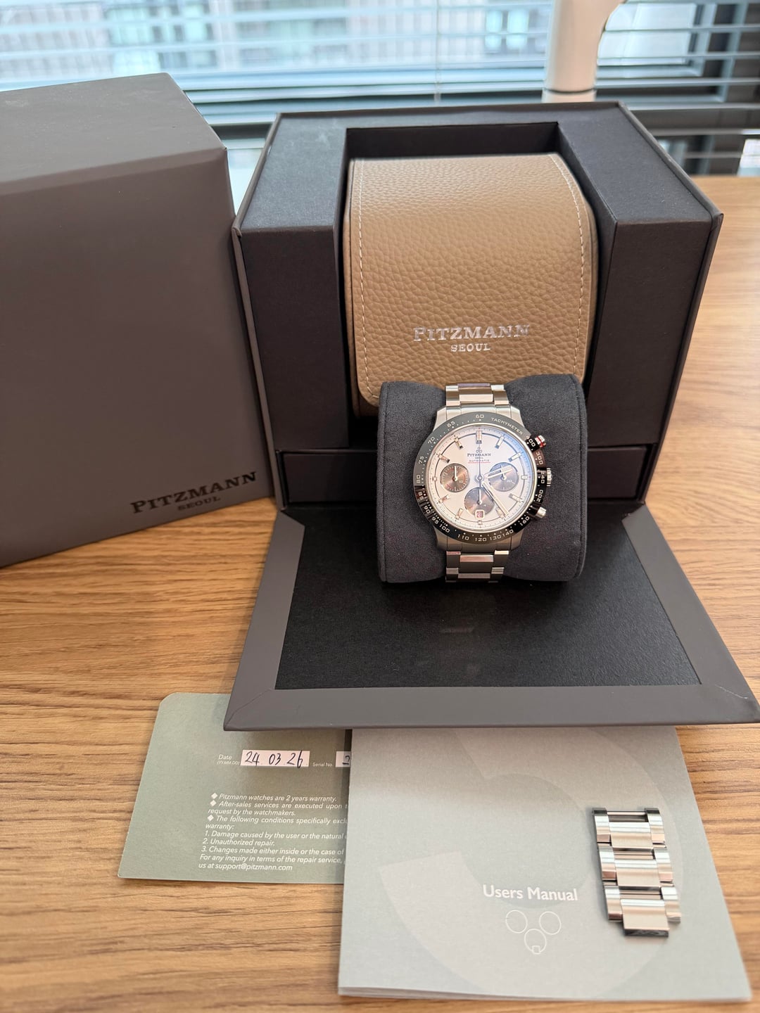 $1,099 shipped CONTUS WatchEx, for sale is a Pitzmann 3 mechanical chronograph powered by the Seiko caliber 8R48(NE88) movement. Original box, warranty card, manual, & extra links included. In excellent condition! Happy to FaceTime for questions or demonstration. Thanks for looking! Timestamp: https://share.icloud.com/photos/0e4kPA-Kk0Jq2Av0GQWQwkZEw Chronograph: https://share.icloud.com/photos/025AGWJVlM5yu_IVcrHHvh3Aw Key specs: - 40mm case (41mm including bezel), 47.5mm L:L, 13.25mm thick - NE88 mechanical chronograph movement: 30 minute counter, 12 hour totalizer, date - 45 hour power reserve - Sapphire glass & ceramic bezel Shipping: UPS or USPS, insured & tracked.