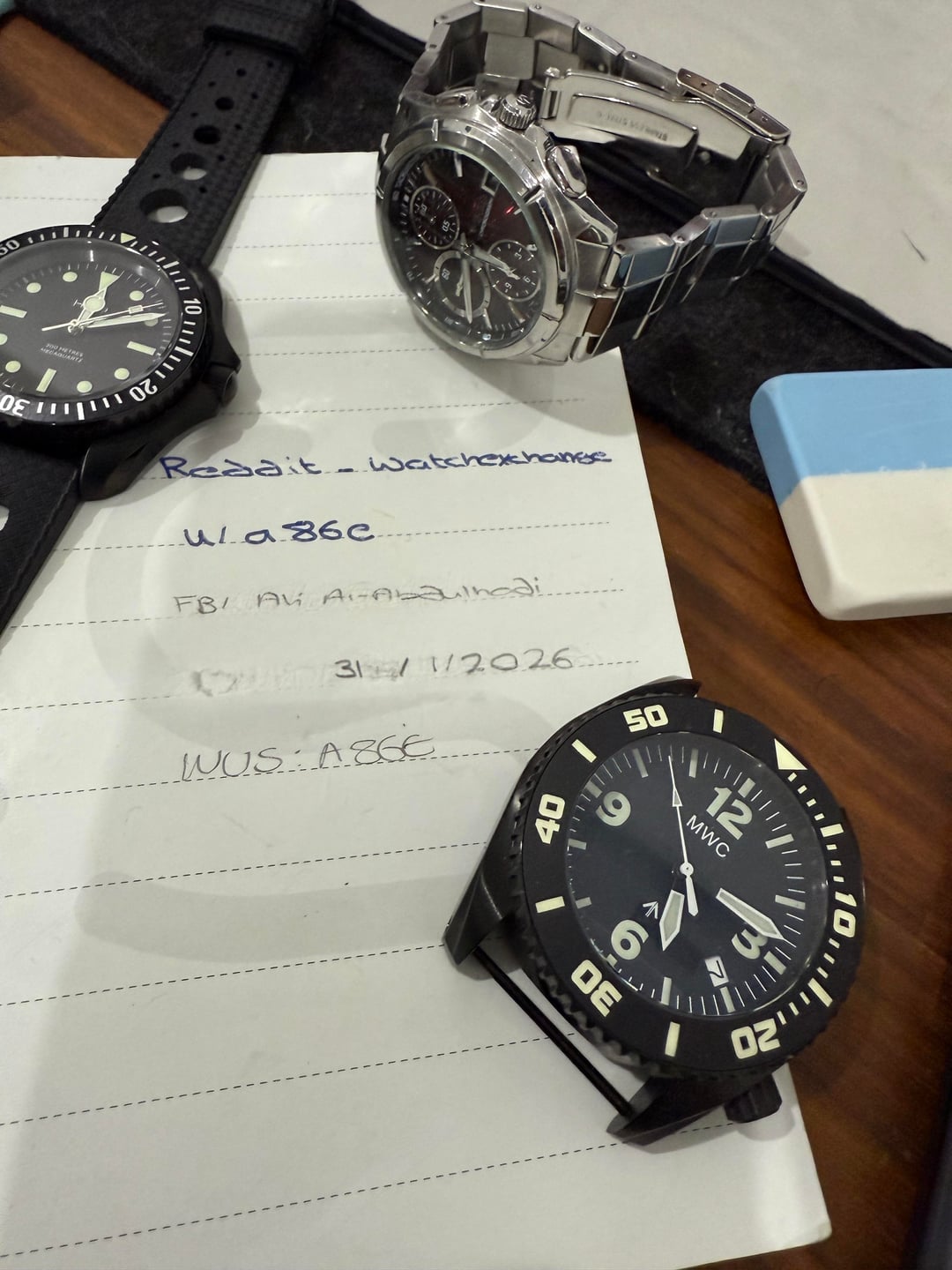 Hey all, I have this tank of a watch, the MWC Depthmaster. NATO is clean, comes with box too. Has a mark on the bezel.but nothing Major. Overall it's a clean example as shown by the pictures. Retails at $660 Specs: Movement: 24 Jewel Automatic NH35A with hacking function and a 41-hour power reserve Water Resistance: 100ATM / 3,280ft / 1000M Crown: Screw-down locking Helium Escape Valve: Yes Dimensions: Width: Including Crown 47mm (Excluding Crown 44mm) Thickness: 18mm Crystal Diameter: 31mm Lug to Lug: 48mm Weight: 140g Bezel: Unidirectional non-reflective with ceramic insert Crystal Type: Sapphire with Anti-Reflective Coating* Case: 316L PVD Stainless Steel Illumination: Luminova on markers, hands, and bezel Strap: 24mm NATO Webbing Strap Price: $475 shipped TYD, loosely negotiable Not interested in trades Please read the disclaimer before shooting a PM Thanks ⸻ Watch Sale Disclaimer: • I am a private collector, not a store or reseller, and I am not affiliated with any watch brand mentioned in this listing. • The watch will be shipped from Kuwait via FedEx, and a tracking number will be provided to the buyer once dispatched. • Buyer is responsible for any customs duties, VAT, or import taxes that may be charged upon delivery, depending on your country’s regulations. • I welcome all reasonable requests for additional information, including more photos and/or videos to verify the watch and its condition. • Payment terms: • Established Watchexchange members with verifiable feedback may pay via PayPal Goods & Services only, I do not accept Friends & Family nor Zelle • New or low-feedback users must pay via wire transfer. All watches are sold as-is, with details described to the best of my knowledge. Serious inquiries only, please. Thanks for looking