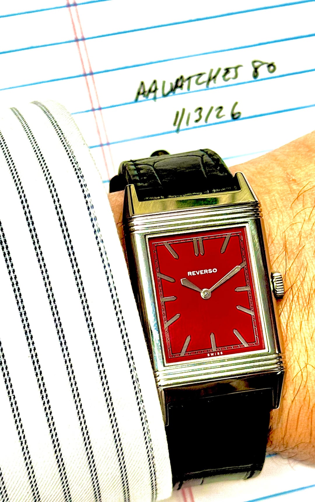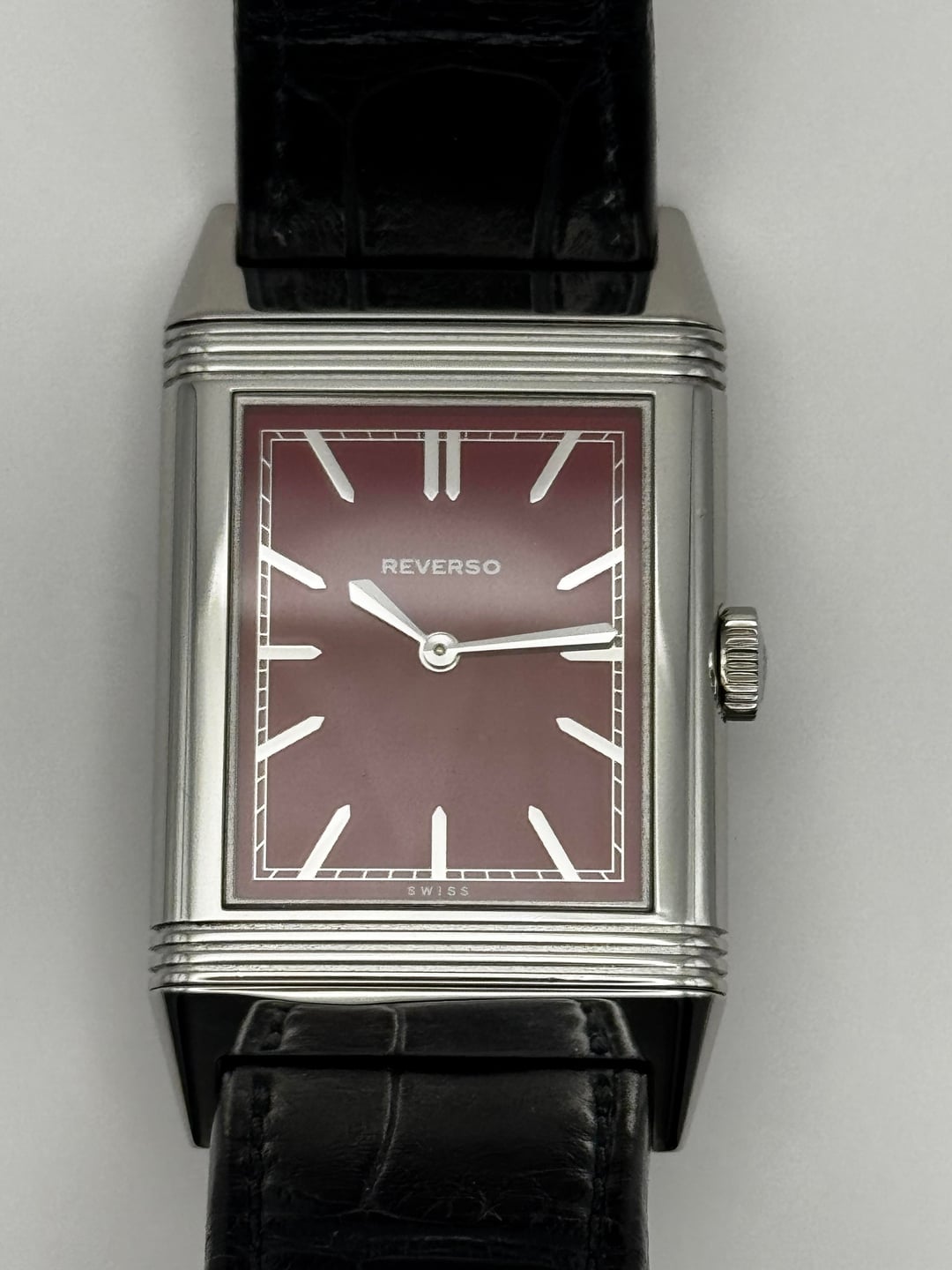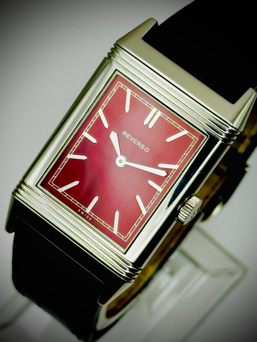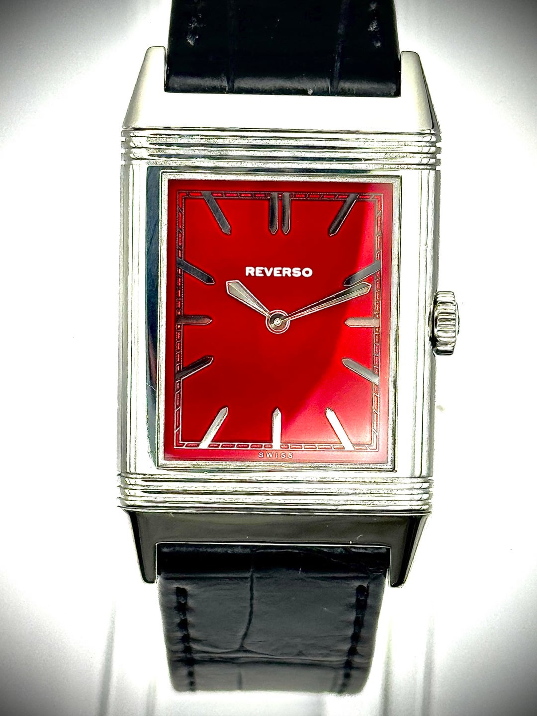 I am selling my Grande Reverso Ultra Thin 1931 Rouge. This red re-edition was a boutique-only special edition originally released in limited quantities in 2012. The case is a slender 7.3mm thick. The dial is a sultry Rouge, which changes accents depending on the lighting. The hour-markers and baton hands are rhodium-plated. The watch absolutely stuns when paired with a dark suit, and pops when matched with jeans. The steel case measures up to the size of the Grande Reverso, being bold on the wrist despite its slenderness with dimensions of 46.8mm by 27.4mm. The 'REVERSO' signature is a reproduction of the early logo as depicted on the vintage model. The in-house caliber 822 measures just 2.95mm thin, beating at a rate of 21,600 A/h and has a 45-hour power reserve. The shock-protected movement (with a KIF antishock system) has 21 jewels and is manually wound. The watch was just serviced by JLC and is in like-new condition without any obvious signs of damage. The watch has perfect mechanical functionality. It has not been altered or personalized on its case-back. It comes with the original JLC black alligator leather strap with JLC-stamped tang buckle. The watch comes as a full set, including Jaeger-LeCoultre box and manual. I purchased it from Watchfinder, which is owned by the Richemont Group, the parent company that owns Jaeger-LeCoultre. It comes with a warranty from Watchfinder that extends until June, 2026, and the additional JLC service warranty covers the watch until October, 2027. I live in NYC and am happy to FaceTime or send more photos or answer any questions. I have done 4 other sales through various websites over the years and have made 8 purchases and can furnish references for them if requested. I appreciate that I am a private seller, but I am a surgeon with a very public job and I am happy to show you my contact information, face, website and cards to prove I am a real person. $15,499 + insured shipping