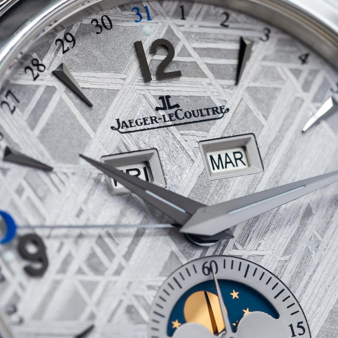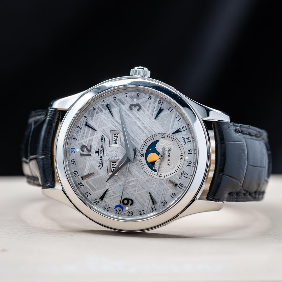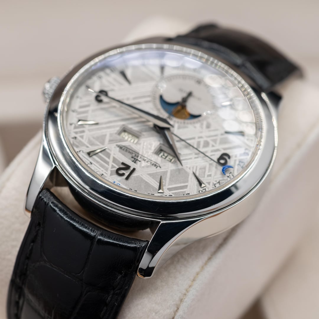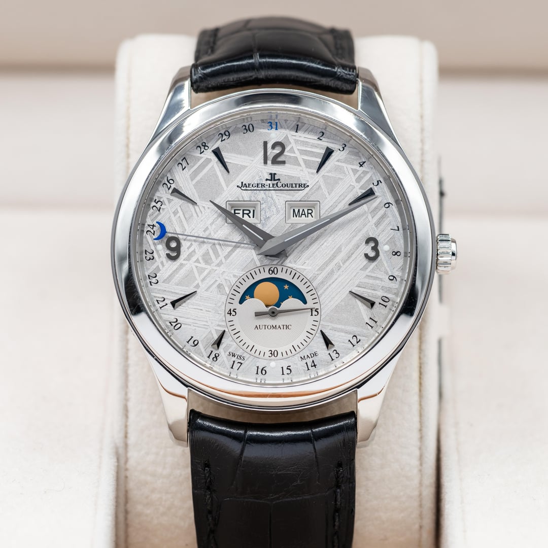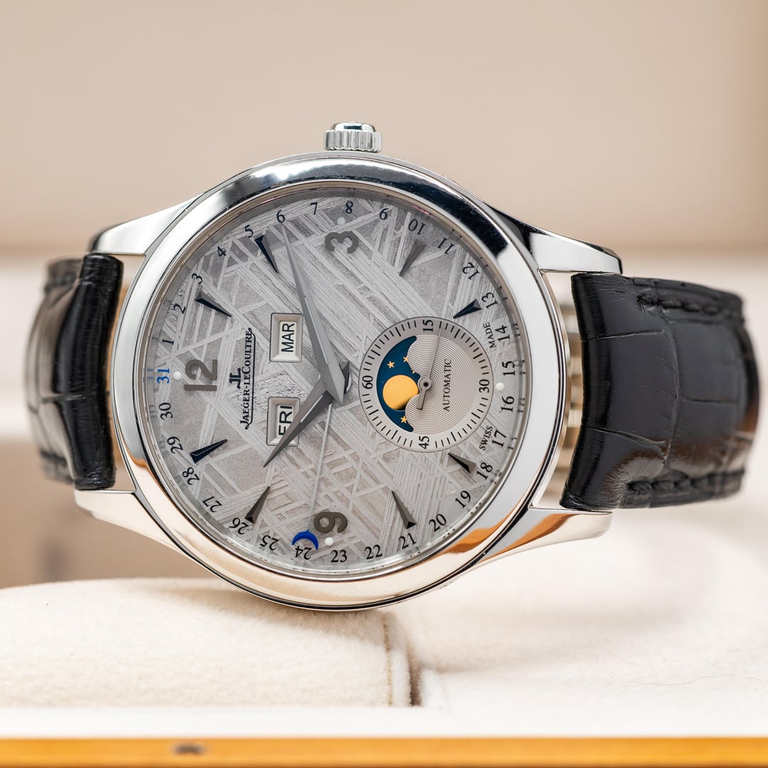 Up for sale here is a hard to come by example of JLC Master Calendar, equipped with the best dial they ever created! Ref. Q1558421. The dial is made from a genuine slice of meteorite, and the Widmanstatten lines looks absolutely incredible as they shift and shine as the light varies. Each one is completely unique, since no piece of any meteorite freezes in the same way as it hurtles through space as a ball of liquid metal! Cased in stainless steel at 39mm, this watch feels excellent on the wrist. Comes on the JLC leather strap with steel deployant buckle. Comes as a full set, as delivered from the AD with the warranty papers dated in 2016. Asking price is $10,500. **All watches sold by us come with a 1 year warranty on movement, case, and bracelet functionality.** We have been trading luxury timepieces since 2017 and operate out of the southeast United States. Accepted forms of payment are wire transfer, trades for other watches, or crypto +2%. Turn your digital coins and memes to IRL assets! After payment has been received, we ship out promptly using Fedex Priority Overnight, fully covered by a private insurance company. Packages are sent to a Fedex Office or Ship Center to be held for pickup. Armored carrier or personal delivery will be arranged for pieces valued over $150k. More pictures or video available on request! Plenty of references available, so deal with confidence! We pride ourselves on customer service, communication, and will do what you need to make this a comfortable transaction. Most brands and models of luxury timepiece are accepted on trade. Rolex, Audemars Piguet, Patek Phillipe, Richard Mille, Hublot, Panerai, Zenith, Breitling, Vacheron Constantin, F. P. Journe, A. Lange & Sohne, etc. I can do cash either way or multi-watch trades for the right deal! Check out our other listings on mechanical-art . com