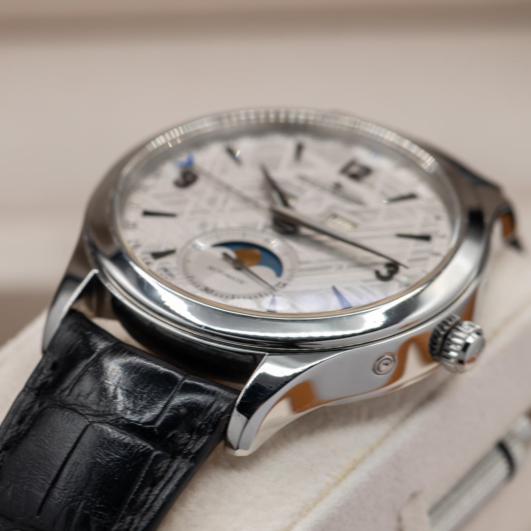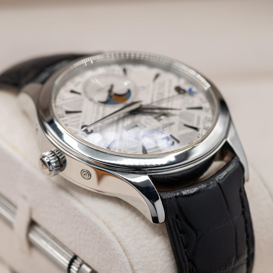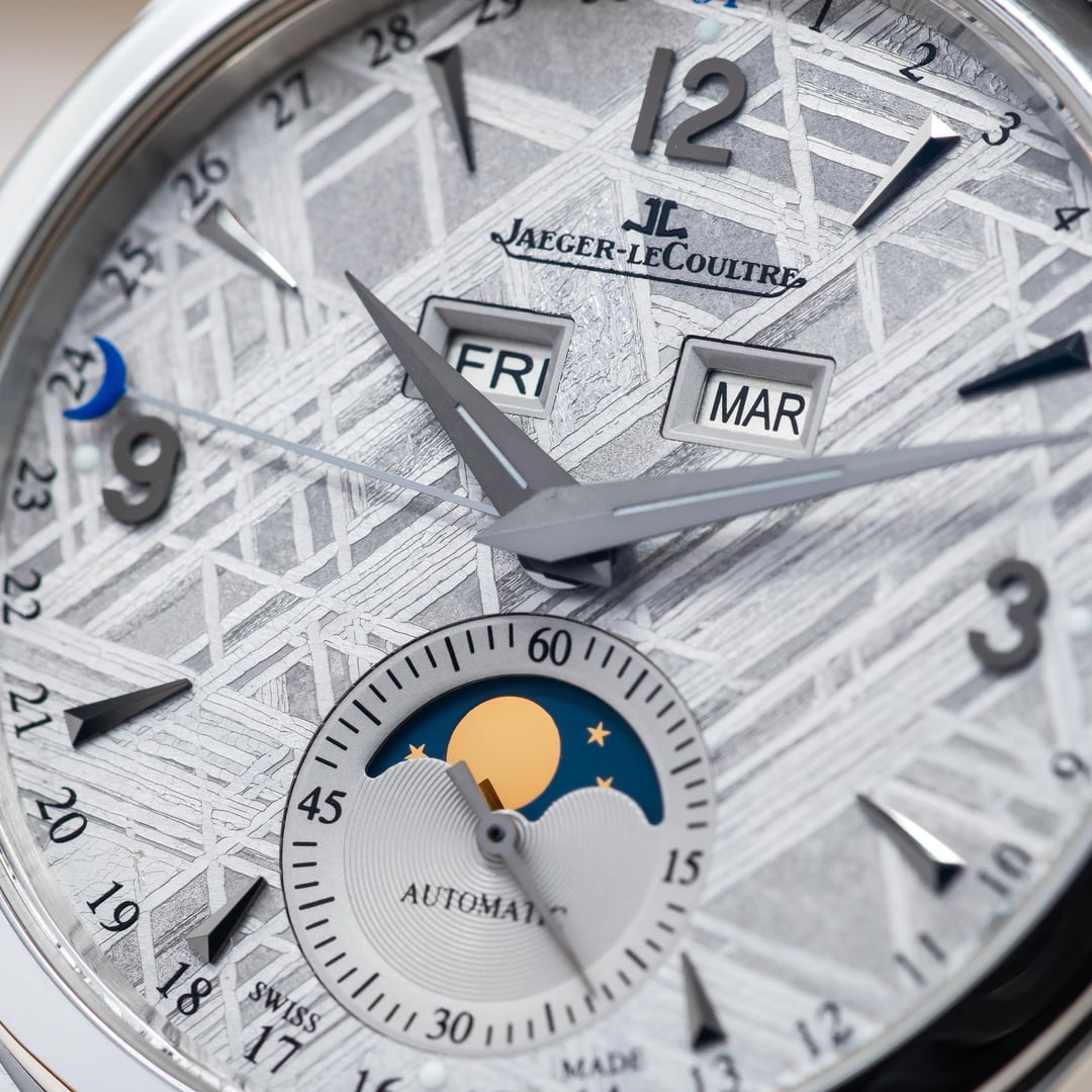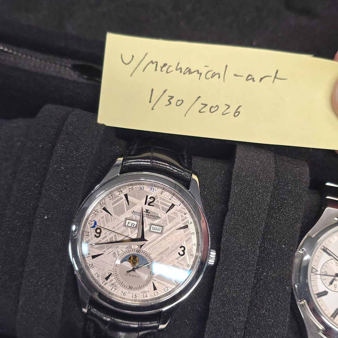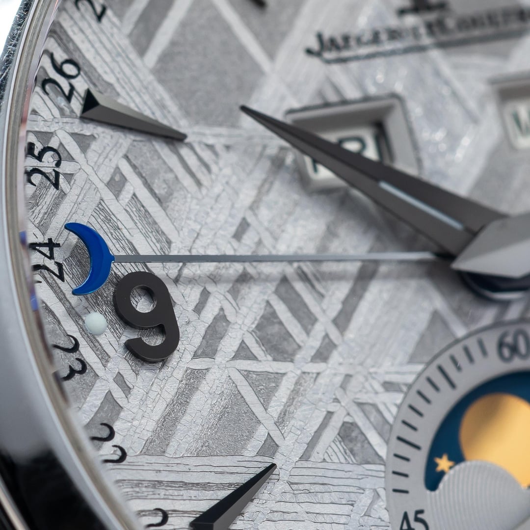 Up for sale here is a hard to come by example of JLC Master Calendar, equipped with the best dial they ever created! Ref. Q1558421. The dial is made from a genuine slice of meteorite, and the Widmanstatten lines looks absolutely incredible as they shift and shine as the light varies. Each one is completely unique, since no piece of any meteorite freezes in the same way as it hurtles through space as a ball of liquid metal! Cased in stainless steel at 39mm, this watch feels excellent on the wrist. Comes on the JLC leather strap with steel deployant buckle. Comes as a full set, as delivered from the AD with the warranty papers dated in 2016. Asking price is $10,500. **All watches sold by us come with a 1 year warranty on movement, case, and bracelet functionality.** We have been trading luxury timepieces since 2017 and operate out of the southeast United States. Accepted forms of payment are wire transfer, trades for other watches, or crypto +2%. Turn your digital coins and memes to IRL assets! After payment has been received, we ship out promptly using Fedex Priority Overnight, fully covered by a private insurance company. Packages are sent to a Fedex Office or Ship Center to be held for pickup. Armored carrier or personal delivery will be arranged for pieces valued over $150k. More pictures or video available on request! Plenty of references available, so deal with confidence! We pride ourselves on customer service, communication, and will do what you need to make this a comfortable transaction. Most brands and models of luxury timepiece are accepted on trade. Rolex, Audemars Piguet, Patek Phillipe, Richard Mille, Hublot, Panerai, Zenith, Breitling, Vacheron Constantin, F. P. Journe, A. Lange & Sohne, etc. I can do cash either way or multi-watch trades for the right deal! Check out our other listings on mechanical-art . com