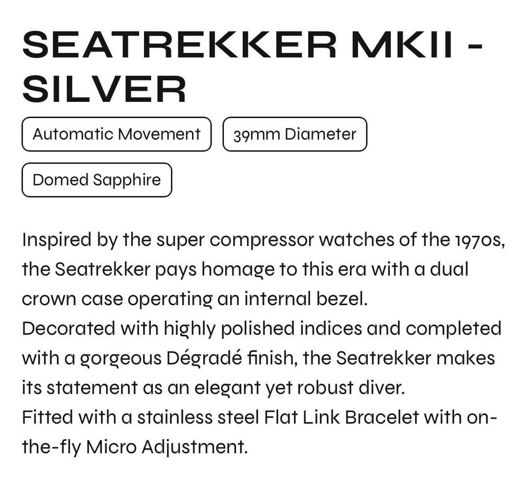 Beaucroft Seatrekker MKII - Silver Purchased December 2025 Very cool super-compressor style diver from a New Zealand microbrand. Worn twice, part of a collection. Excellent watch, just moving out to make way for something incoming. Like new condition - full kit, almost two years warranty remaining. $395 plus $25 shipping with tracking No trades please