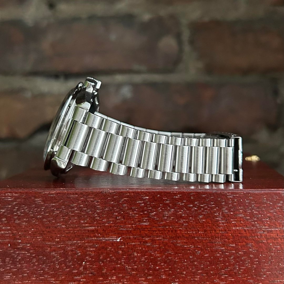 Ridiculously gorgeous warm patina. With a long “R” dial and the best omega bracelet ever in my opinion. This 1450 bracelet with 808 solid end links is fully linked and can fit up to 8” wrists. Possibly larger. To size this, you should bring it to a jeweler or professional unless you’re extremely confident in your skills.