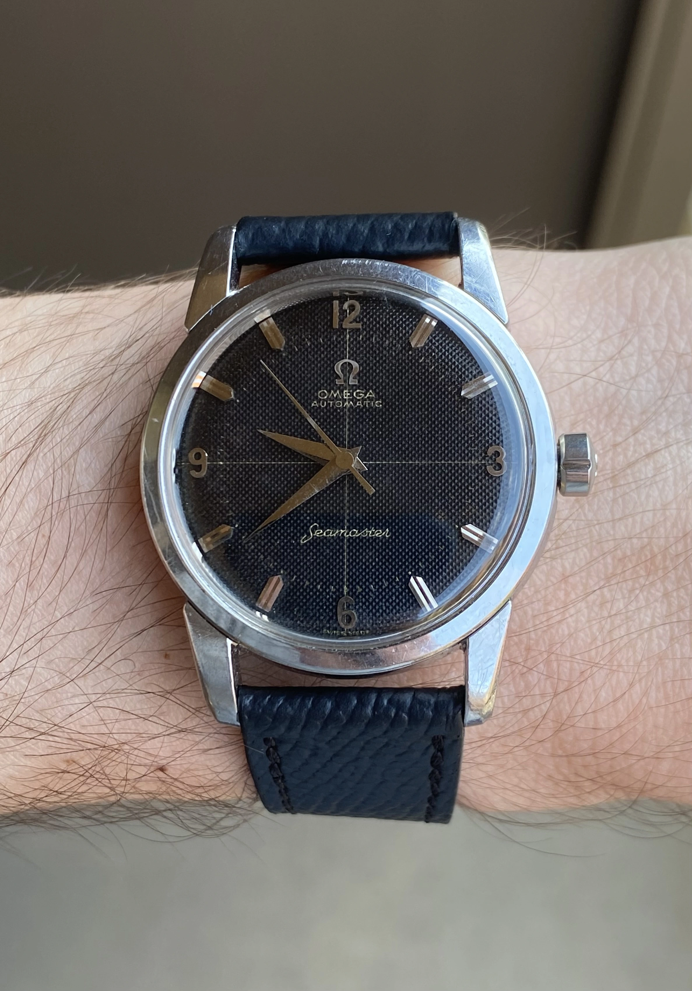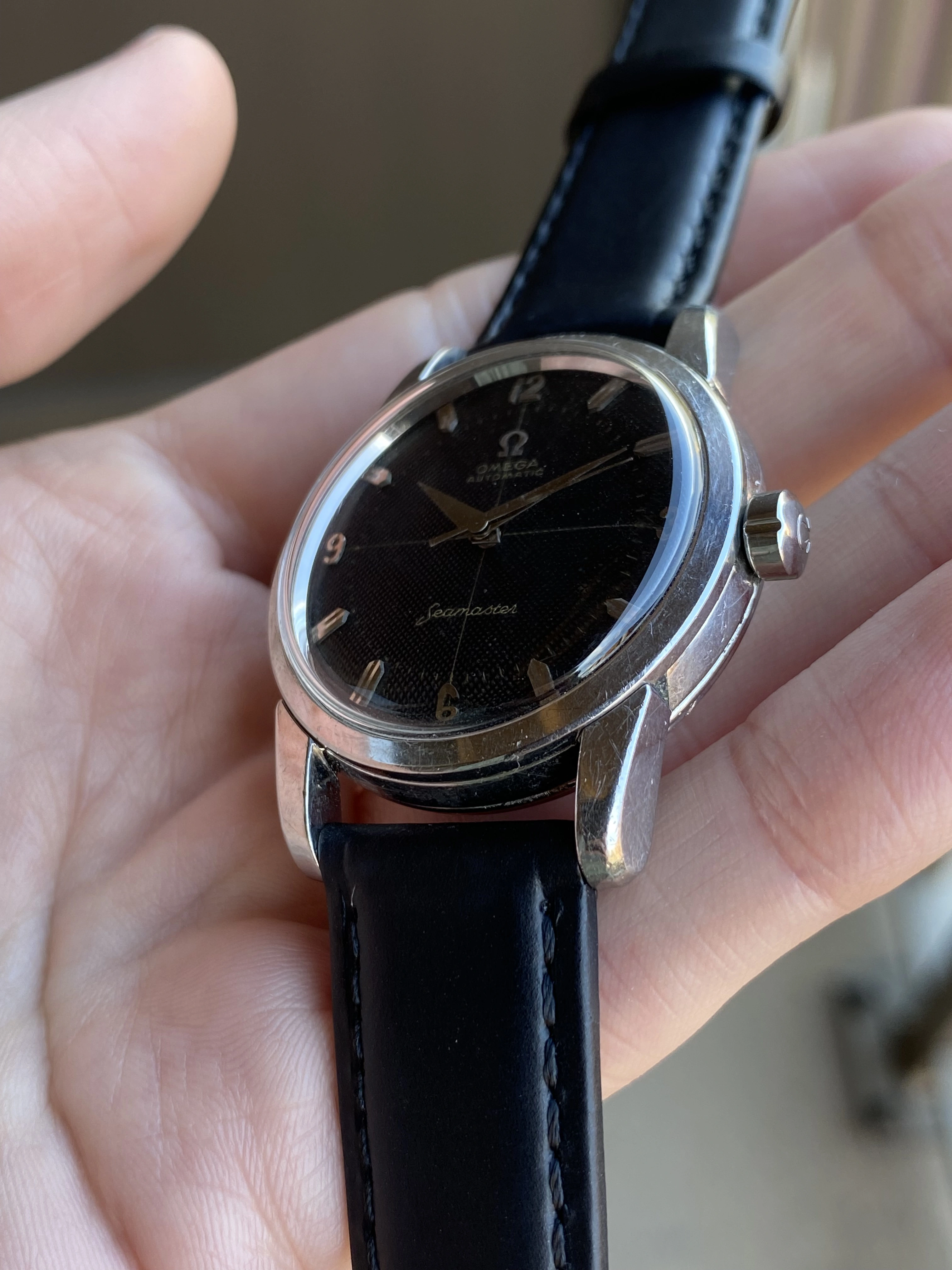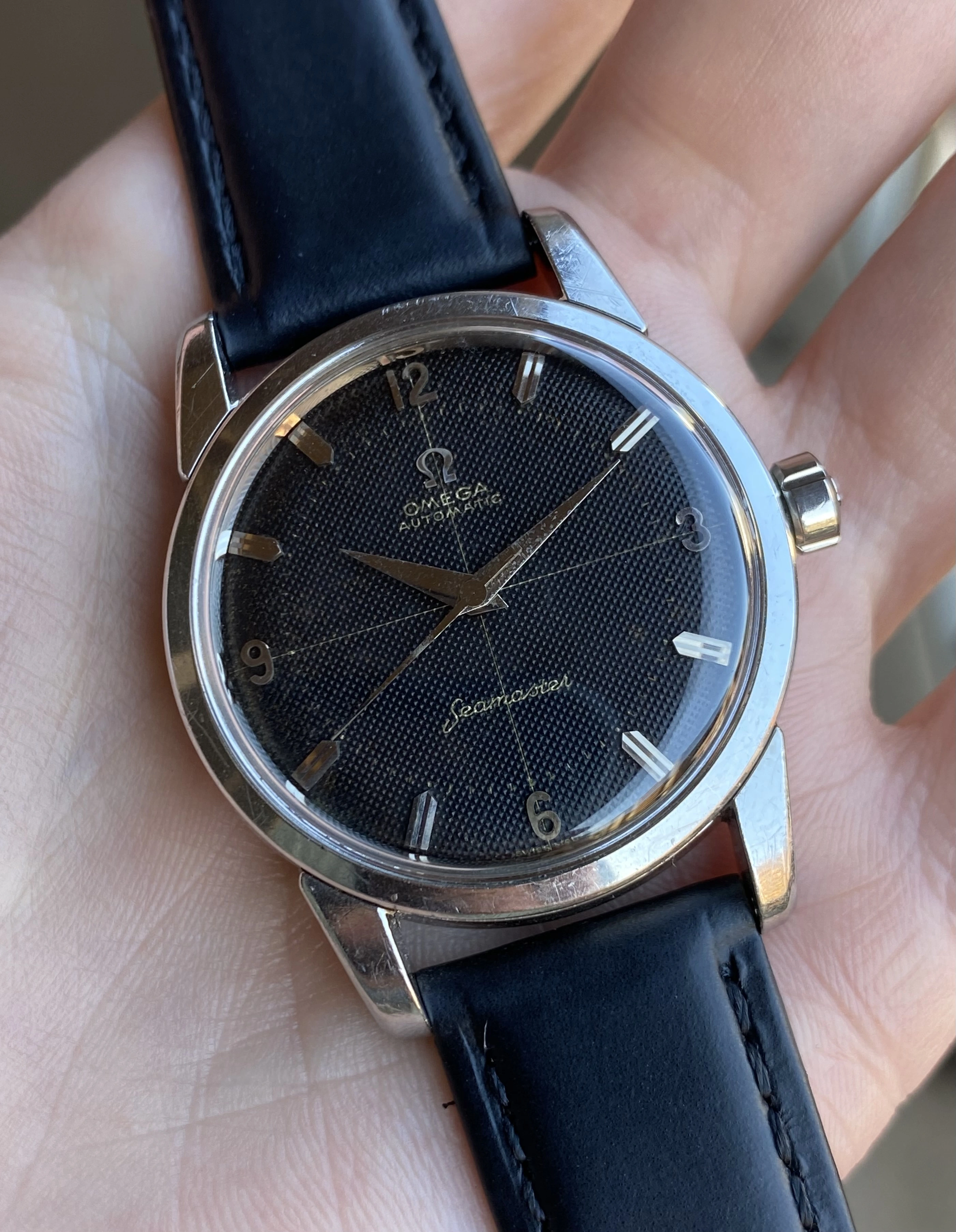 Up for sale is another that I’m sure I’ll regret selling but that just doesn’t get the wrist time it deserves. It’s a grail vintage Seamaster - a beefy lug steel 2846 ref. featuring an original black waffle dial with a crosshair and arabic numerals. As if that wasn’t enough, it’s a big hippocampus caseback model, made only in ~1958. Full info is below, and don’t hesitate to message me with questions.
