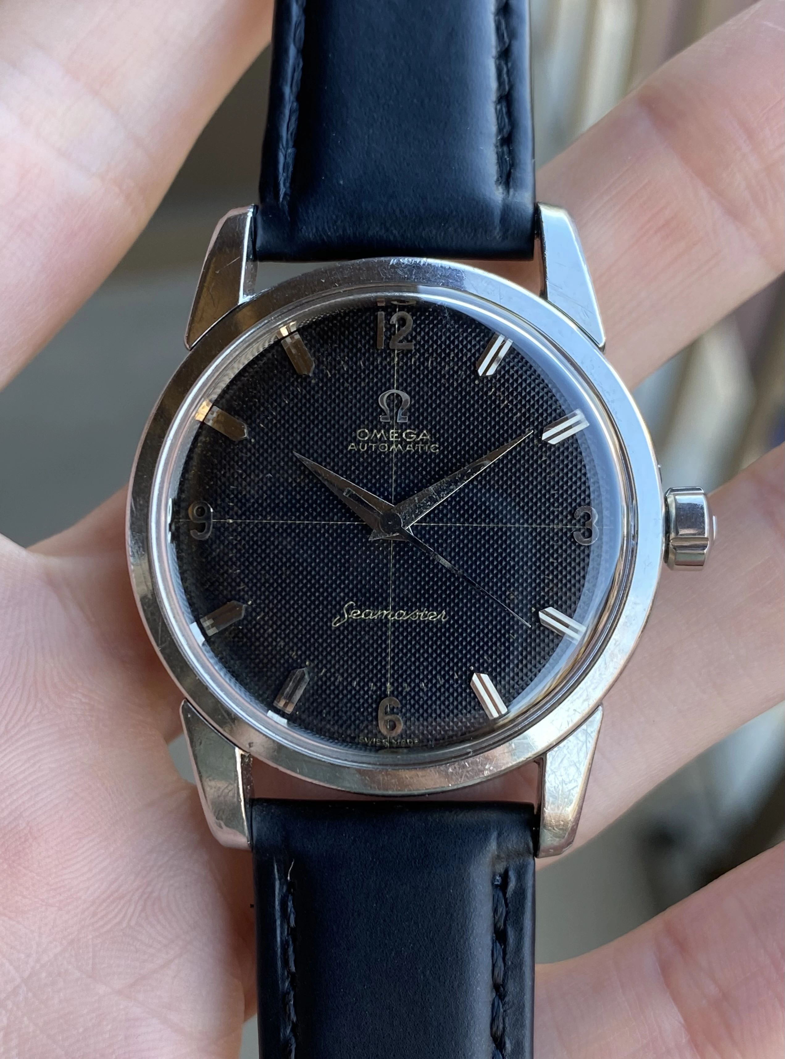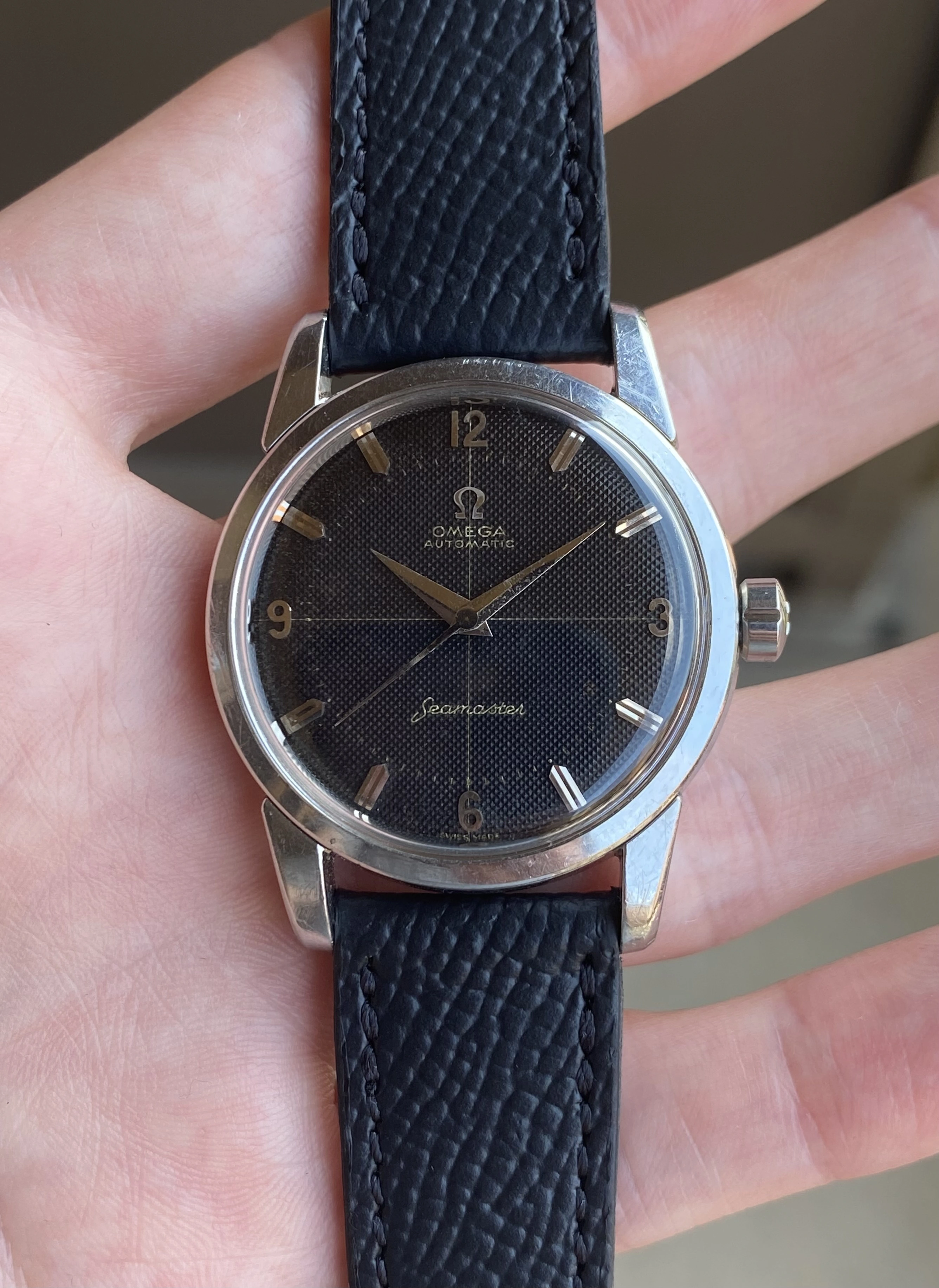 1958 Beefy Lug Steel Omega Seamaster w/ Black Waffle Crosshair Dial & Big Hippocampus Caseback