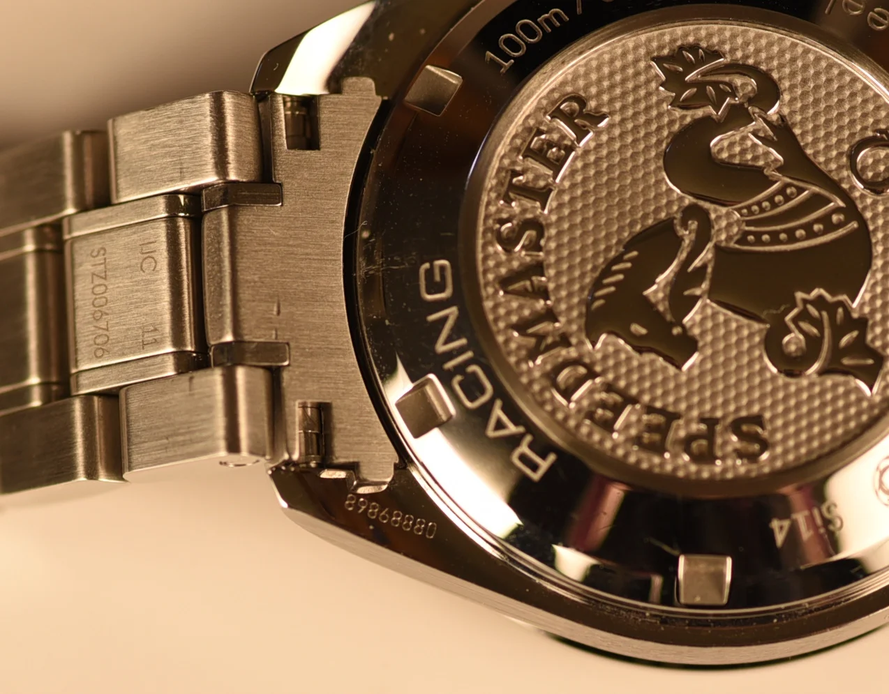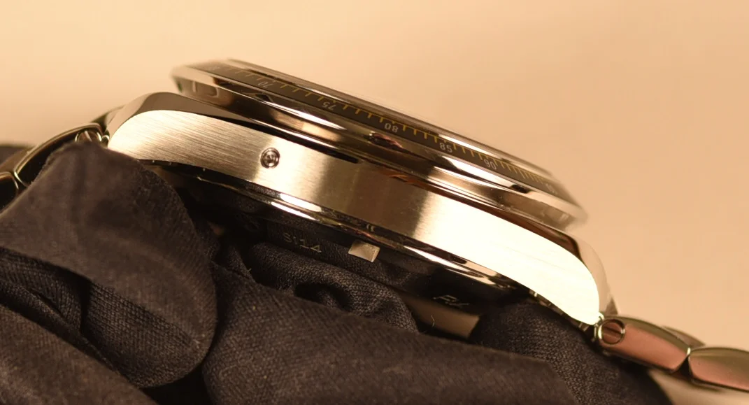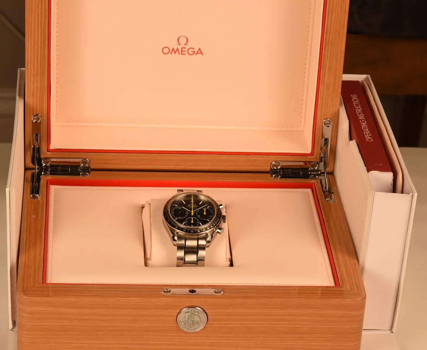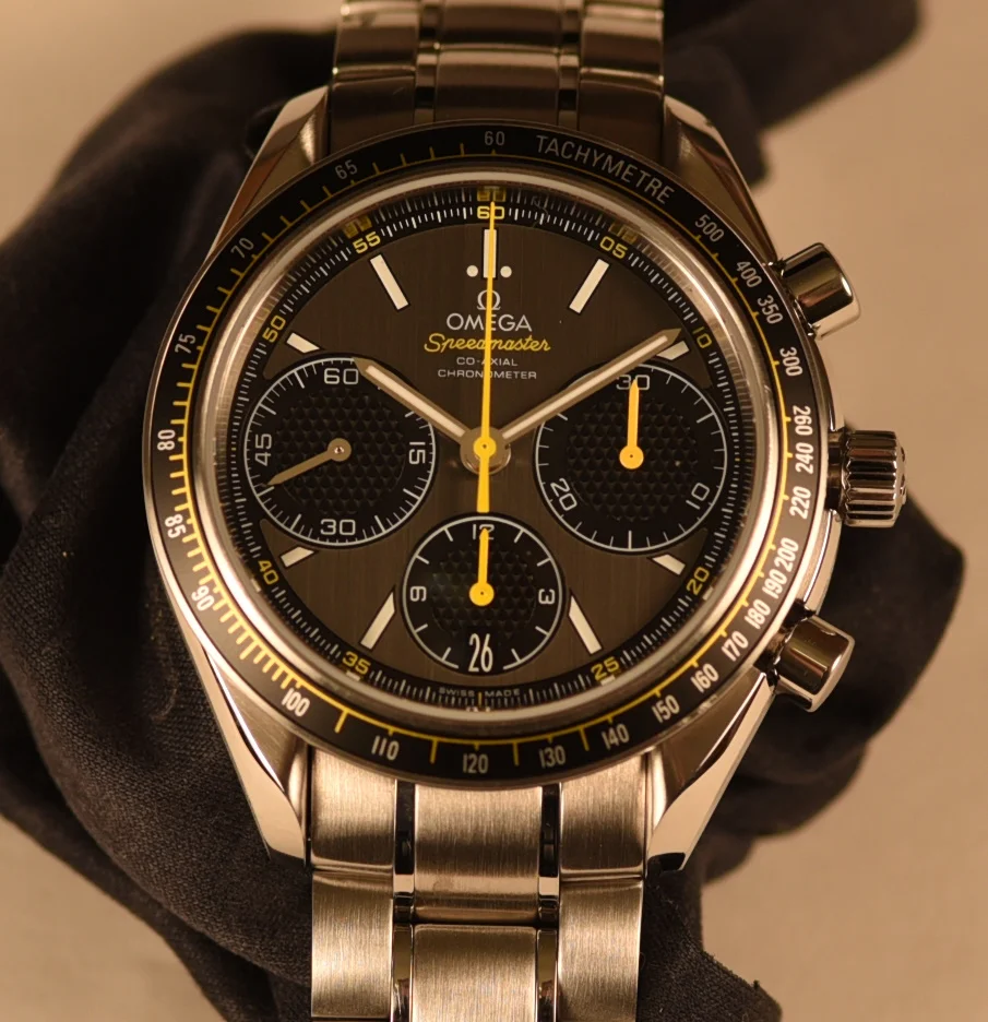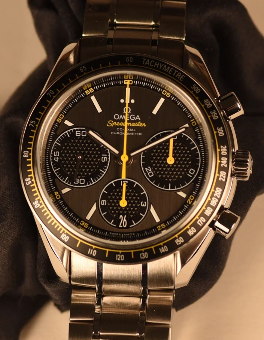 The bezel, with its matt black aluminium tachymetric ring, is mounted on a 40 mm stainless steel case and is presented on a stainless steel bracelet. Powering this timepiece is the Co-Axial calibre 3330.