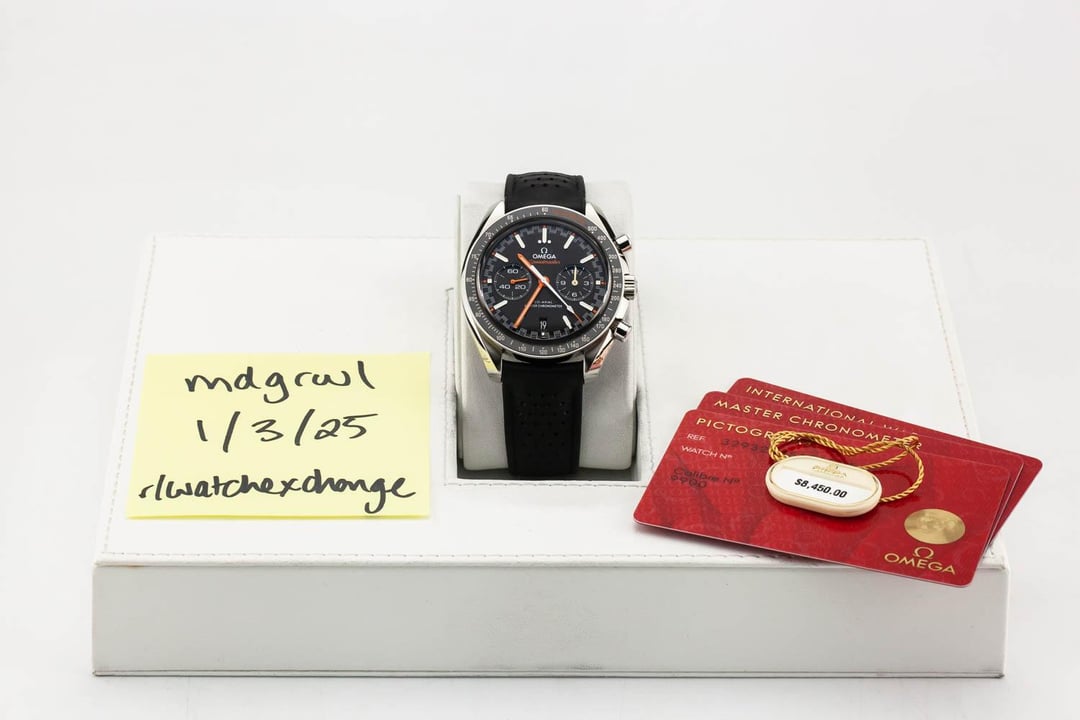 Up for sale is an excellent condition Omega Speedmaster Racing Master Co-Axial Black & Orange Dial, reference # 329.32.44.51.01.001. It comes complete with all boxes, papers, booklets, hang tag and Omega Warranty Card dated December 2020. Excellent Condition / Complete Set **Item Details:** Omega Speedmaster Racing 44.25mm Stainless Steel Case Master Co-Axial 9900 Chronometer **Timestamp:** [https://live.staticflickr.com/65535/54244291149\_28788dee61\_b.jpg](https://live.staticflickr.com/65535/54244291149_28788dee61_b.jpg) **Trades:** We are cash buyers and will consider all modern trades. **Payment:** Listed Price is for Bank Wire, Zelle or any no-fee payment method. Paypal is an additional 3.5%. **Price:** $5750 - Shipped 2 Day Air ! **Shipping:** Fedex Express within the US. International Shipping adds $150. **Returns:** Returns accepted within 48 hours of receipt only if the watch is misrepresented. **Contact:** Feel free to PM me, email: [[email protected]](mailto:[email protected]) or call / text 207-209-4000 Buying a watch on the internet can be scary. We know. You want an established business, accurate presentation of product, followed up by quick responses, and expedited shipping. We understand. That is why we deliver this along with honest, straightforward transactions backed by our well-built reputation. We are new to Reddit but have been selling on forums for many years, and have literally thousands of references. All photography is original. 6.625% state sales tax applies to New Jersey shipping addresses only.