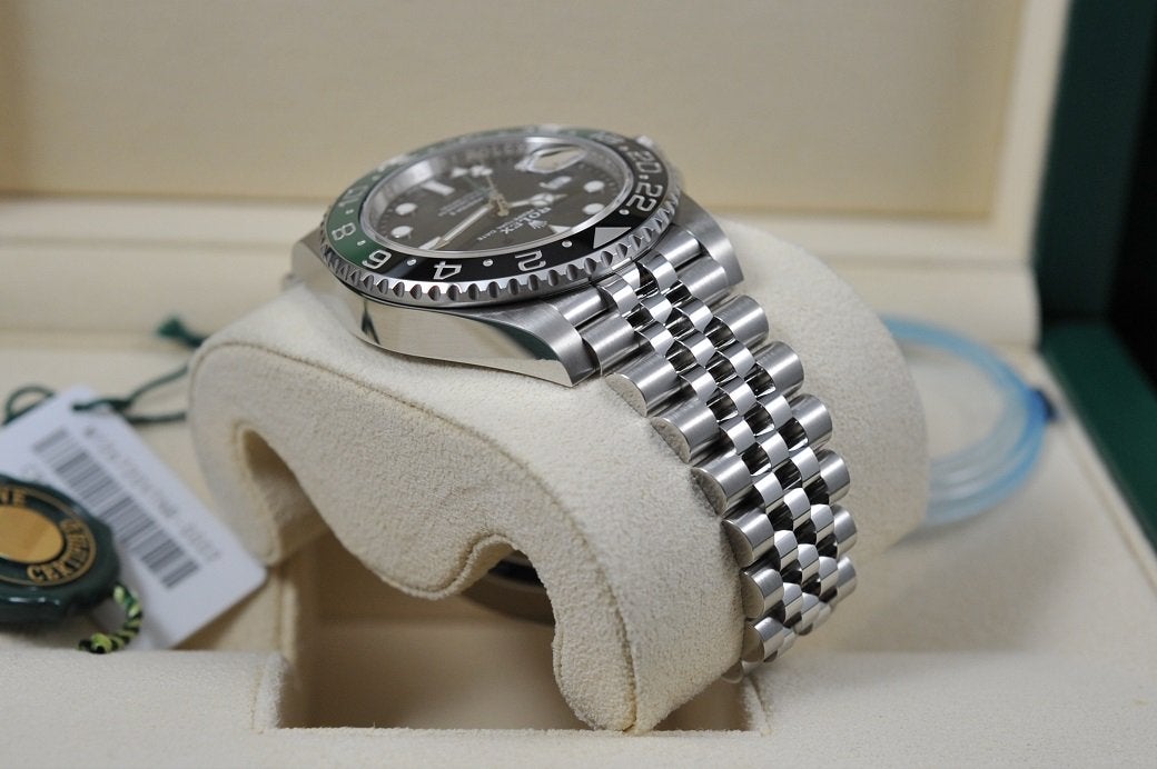 Up for sale is a Rolex GMT Master II stainless-steel travel watch with model reference 126720 VTNR with the black dial and green/black ceramic bezel (aka Sprite) that comes with boxes, papers/card (dated 12/2024), books, tags (green hologram and white hangtag with matching serial number), bezel protector, and complete links. This Rolex sports model is under full international warranty. This is a new (er) model GMT Master II designed for a "lefty". It is a "Rolex-first" so this model will definitely appreciate in value over time.