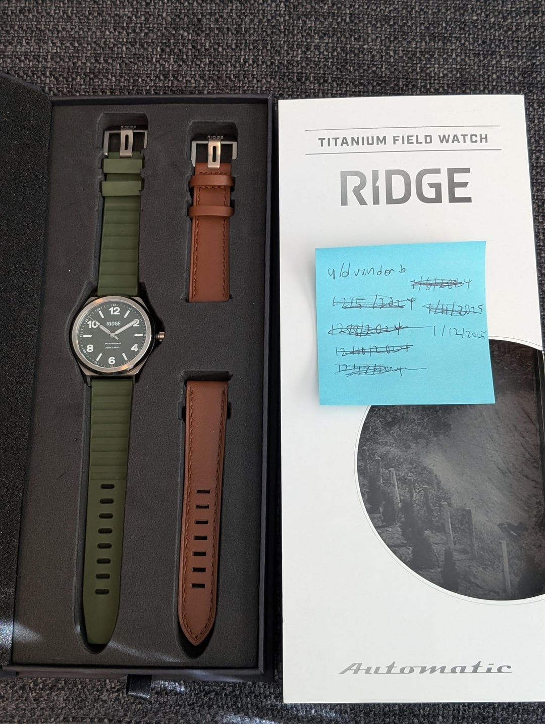 For sale today is a Ridge Titanium Field Watch 40mm Green in excellent condition. Both includes straps are unworn and the watch head itself has nothing to note. This has a Miyota 9039 movement in it. Asking $180 shipped CONUS.