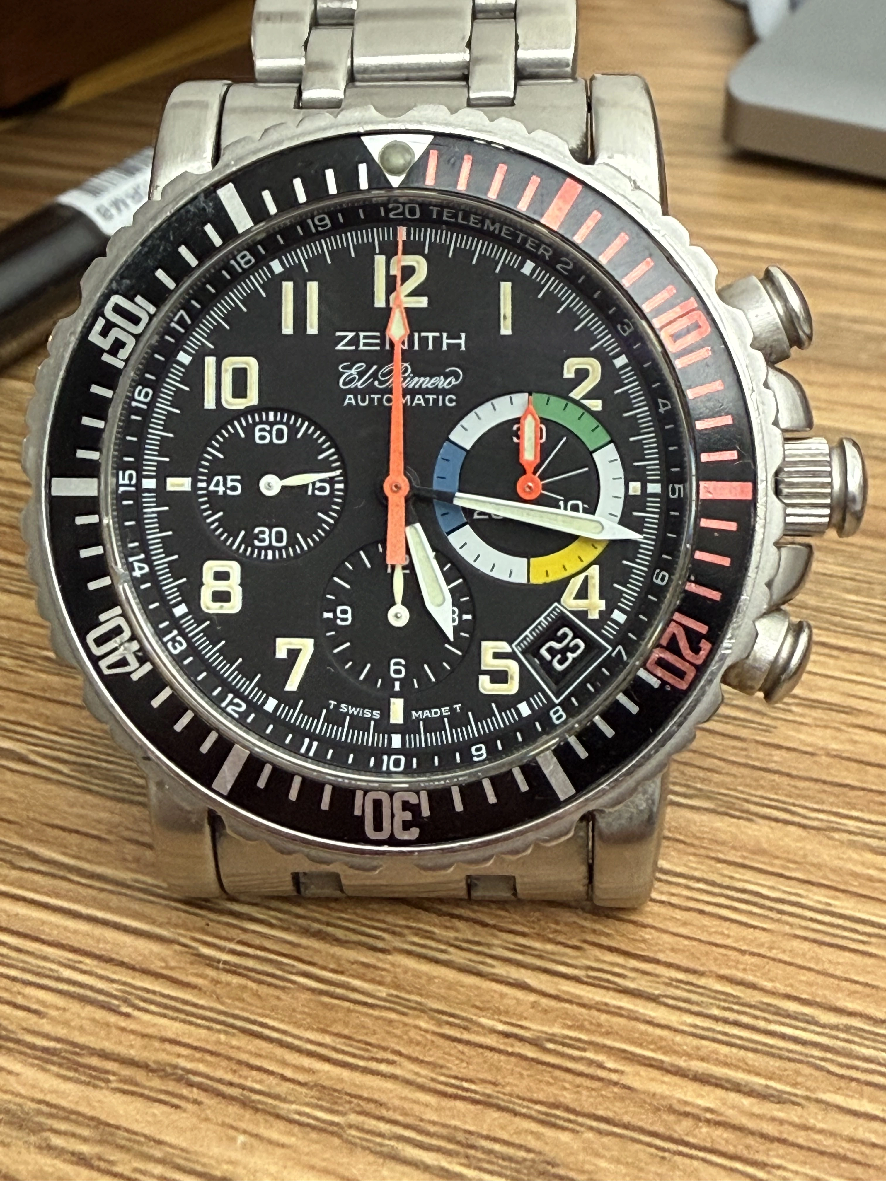 This is the earlier 1990s version with tritium hands and dial not later luminova. Fantastic multi faceted, multicolour dial with all original tritium. These watches were supposedly created to answer a French air force request for a new pilot watch but the order was cancelled before delivery. Could be an apocryphal tale, but, hey, everyone loves a good back story. Fitted with the iconic Zenith El Primero movement, one of the very first ever automatic chronograph movements and used for many years in the Rolex Daytona. Here the El Primero movement is fitted with a flyback function for quick timer resetting when in a barrel loop over enemy territory. Or something. Unmarked dial and hands, original red/black bezel in excellent condition, small scratch at 40, never noticed on the wrist but visible in these photos. On the lovely OEM Zenith bracelet which fits a 7.5 inch wrist.