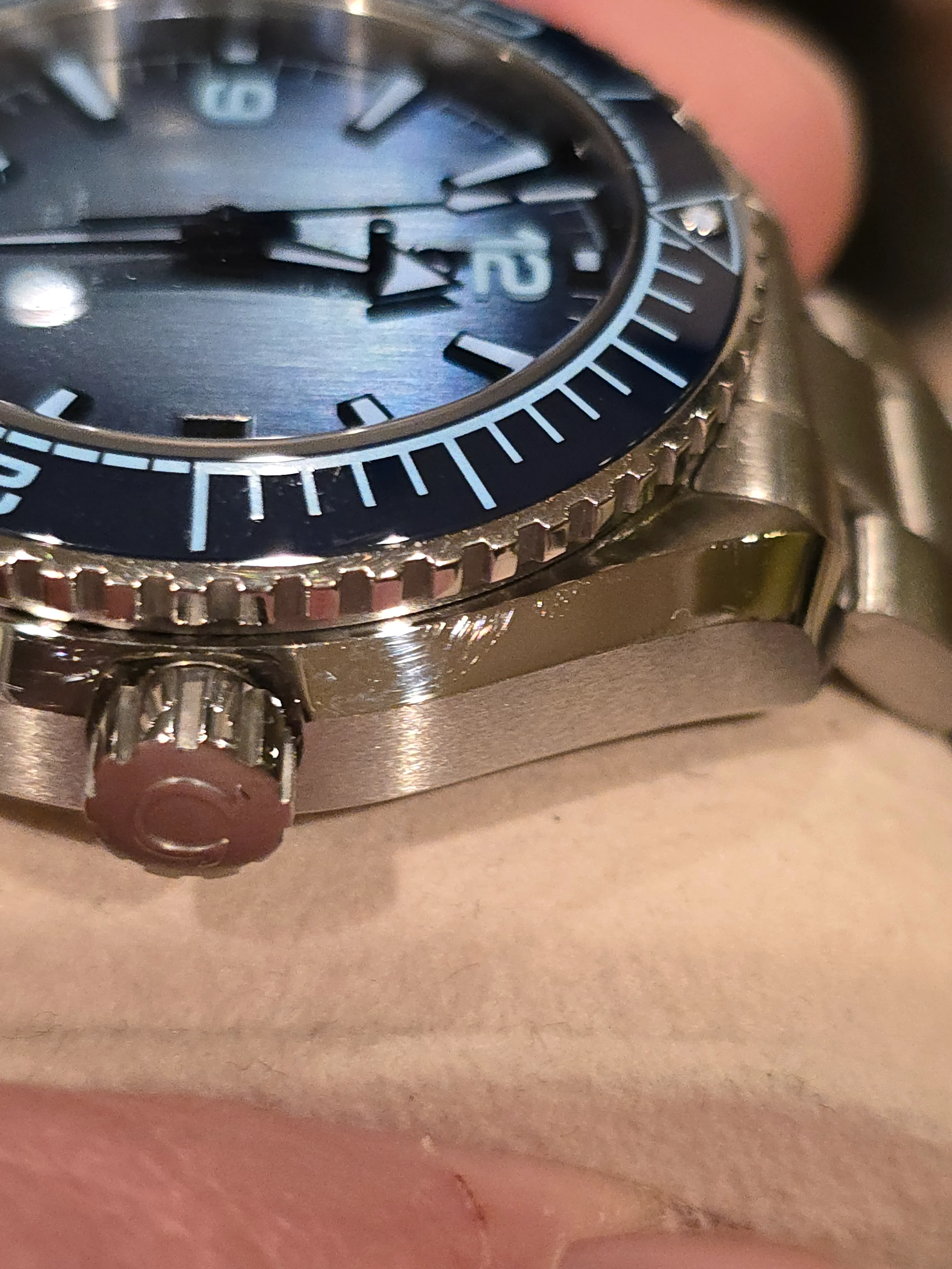 The next set are holding the watch at certain angles in bright light to try to highlight those micro-scratches from wearing it. I'd rather have you pleasantly surprised by how much better it is in real life than be surprised at it being worse.