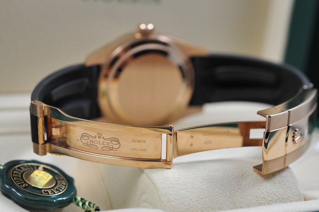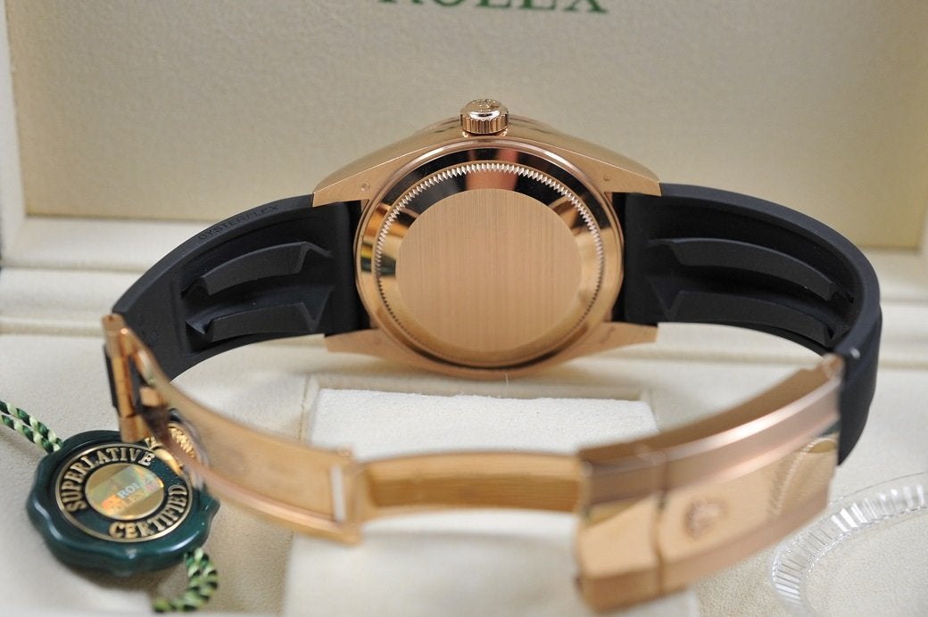 Condition is VG; will show normal signs of careful wear. There will be minor marks on the rose gold side cases. There are some minor desk dives on the polished rose gold clasp. The clasp will show normal desk dives due to careful wear. The oyster-flex band is VG - lots of life left. Fluted bezel is VG. Dial and crystal are flawless. Watch runs solid as it should. Overall, this watch is in very good condition; ready to wear and enjoy.