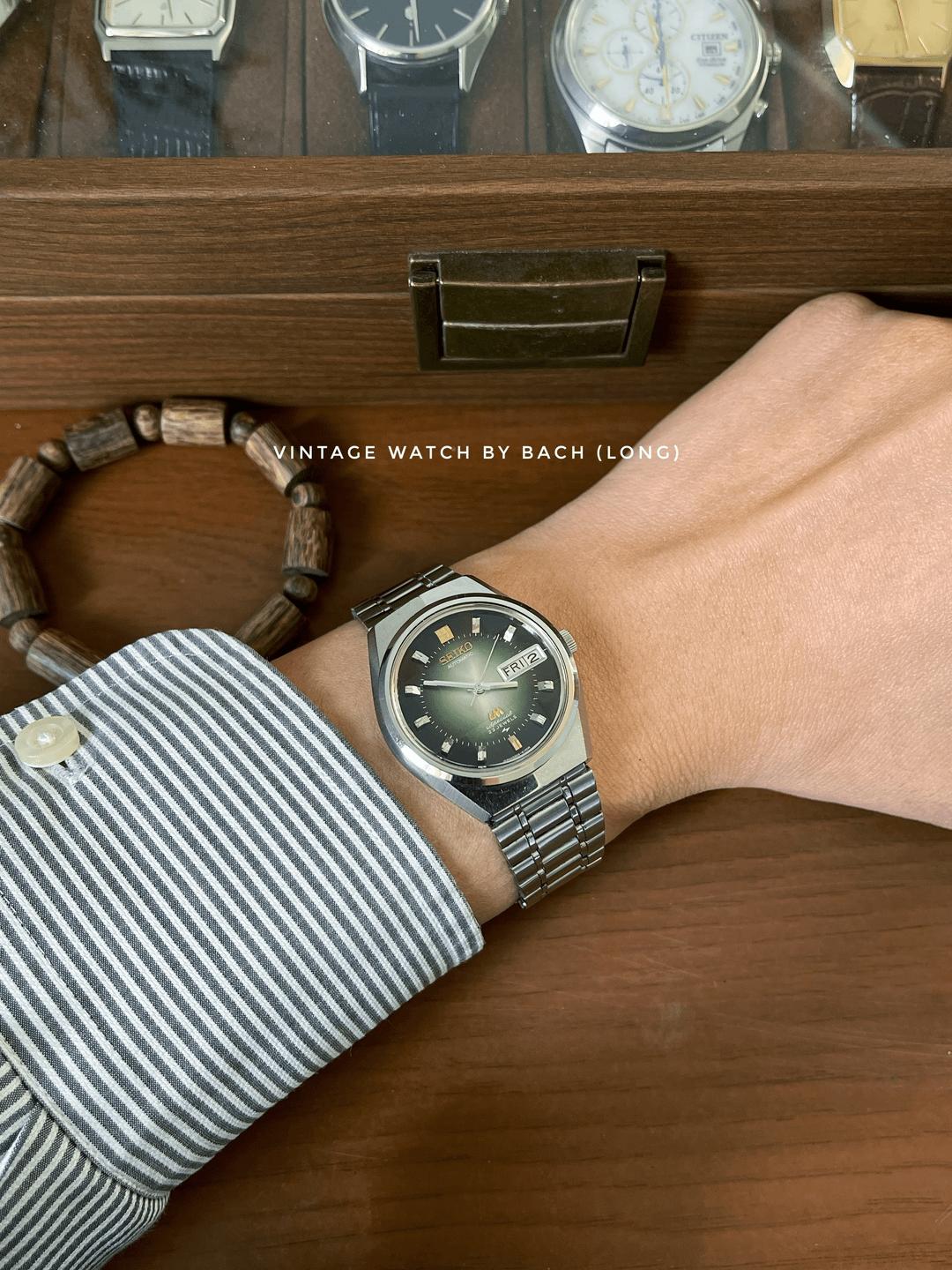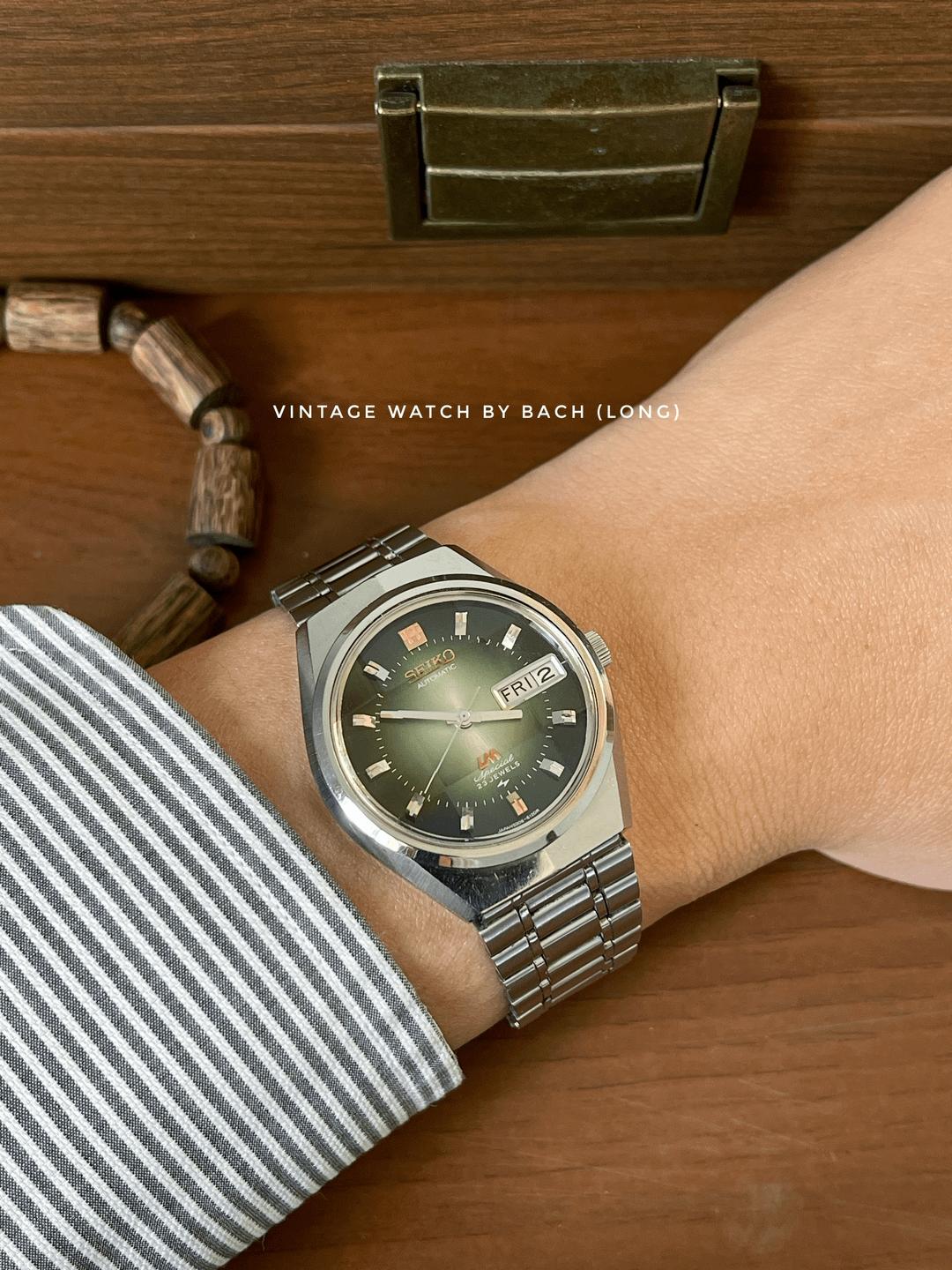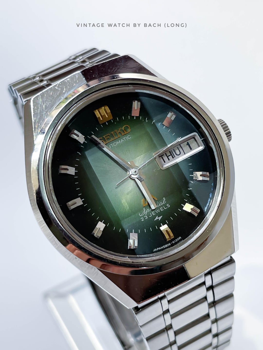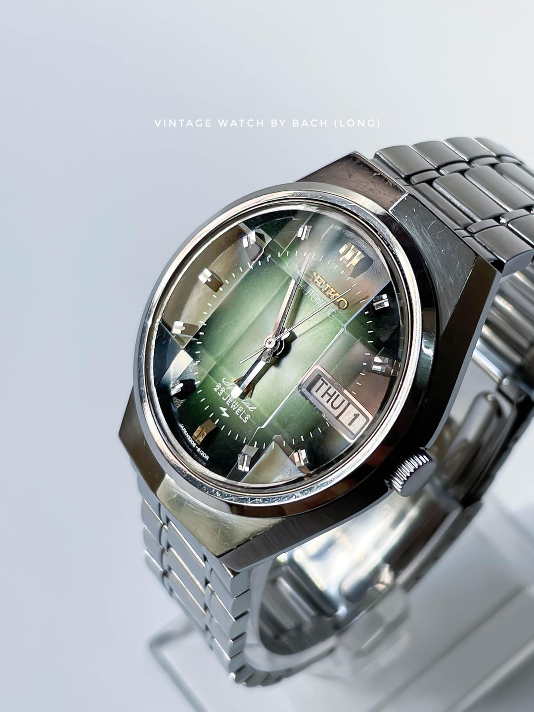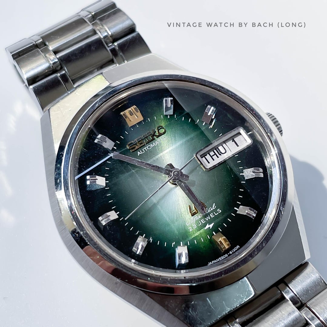 **Seiko LM Special 5206-6100 Sunburst Green Faceted Crystal** **SPECIFICATIONS:** \- Seiko Lord Matic (LM) Special very good condition from January 1973. Classic and vintage style. \- Seiko LM caliber 5206 is an automatic (with hand winding) watch movement, which powered most high-end mechanical watches from Seiko back in the day. Rotate the crown clockwise to wind the mainspring. \- Original Seiko LM stainless steel bracelet, fit up to 18.5cm wrist. \- Stainless steel case size 36mm (without crown), Lug to Lug: 38, Lug Width: 18, Thickness: 10mm. Suitable with all wrist size. \- Sunburst dradiant green dial, 3 shinny baton hands with classic raised hour markers. Bold calendar box for Kanji/English day and date. Faceted crystal add up to the overall sharpness and bring interesting effects when seen from different angle. \- Shinny 3D logo of Seiko and LM brand with gold tone, fascinating to look at. The lightning bolt logo applied at the bottom of the dial, mean Seiko’s Daini factory. **CONDITION:** The watch is very well preserved for its age (See Photos). The case have some inevitable hairline scratches. The dial and crystal are in very good condition. The original movement works well (keeping the time, changing the day and date). Please note that only setting the date/day in 6-7 o’clock (safe time), must not change it in 9PM-4AM or it will damage the movement. The day and date can be set with the crown in first position (one notch out). Turn the crown clockwise to advance the date wheel by one day. Turn the crown counter-clockwise to advance the day wheel. The time is set with the crown in second position (pulled all the way out). Recommend to avoid getting wet for vintage watch. The watch has been tested for 1 month and operate stablely before selling. **SHIPPING AND PAYMENT:** \- Worldwide shipping via UPS (cost me 60-80 USD) with tracking number. 6-8 business days. \- Price 370 USD (free shipping). PayPal F&F or G&S (+4.4% transaction fee paid by buyer) \- Import duties, taxes and charges are not included in the item price or shipping charges. These charges are the buyer’s responsibility. Please check this prior to buying. These charges are normally collected by shipping company (UPS). For more beautiful watches, visit: Etsy store: [https://vintagewatchbybach.etsy.com](https://vintagewatchbybach.etsy.com) Chrono24: Please DM for product links. Ebay store: [https://www.ebay.com/usr/vintagewatch\_bybach](https://www.ebay.com/usr/vintagewatch_bybach) Instagram: [https://www.instagram.com/vintagewatch\_bybach](https://www.instagram.com/vintagewatch_bybach)