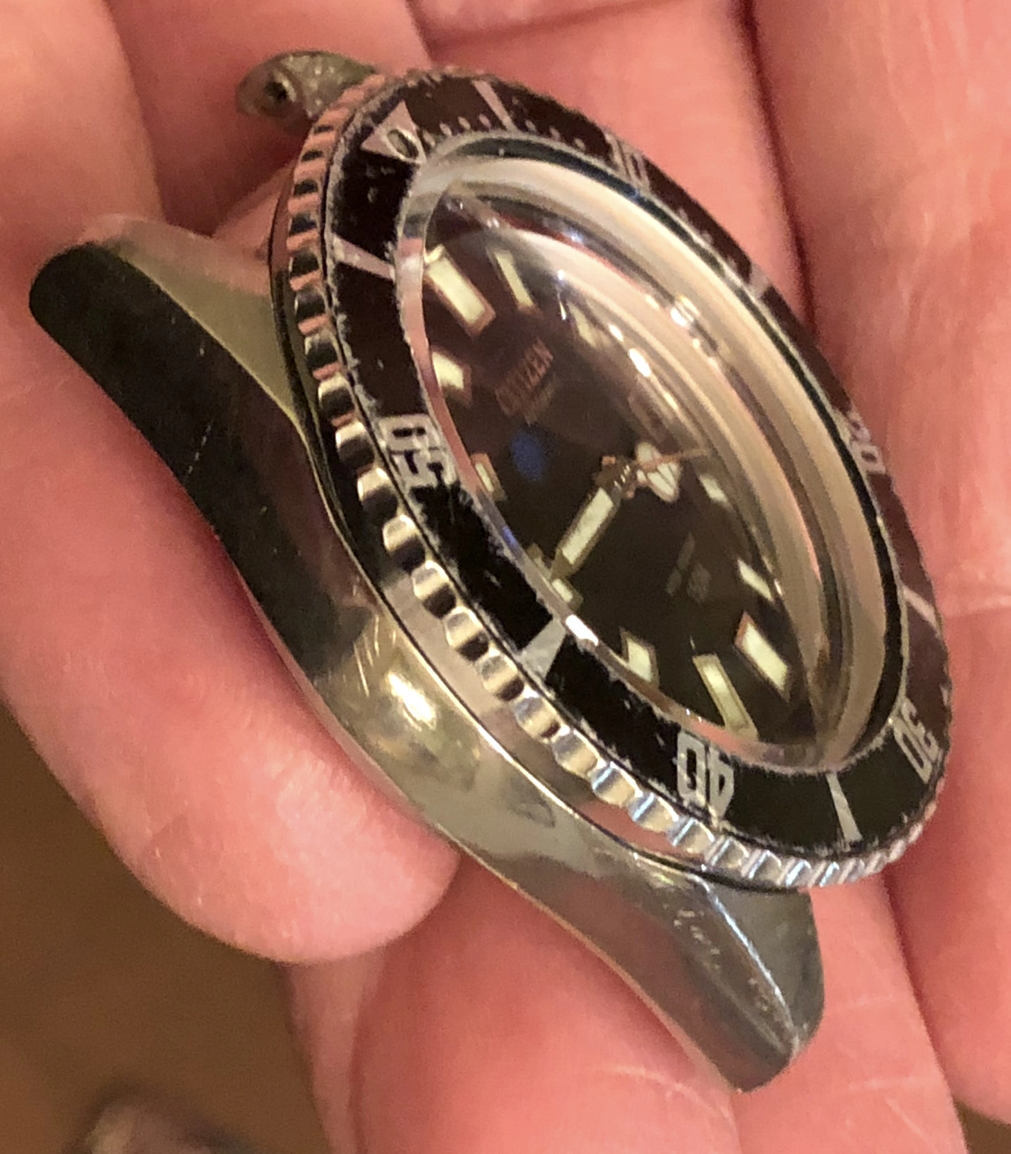 I have a couple of other Challenge Divers I would sell, including a well-worn but rare B52806 (the export version of the first Challenge Diver, with the unique spear-fisher case-back) and a pristine 52-0110 with original H-link bracelet. Both would be a bit more expensive than this one. [Edit: both are sold now.]