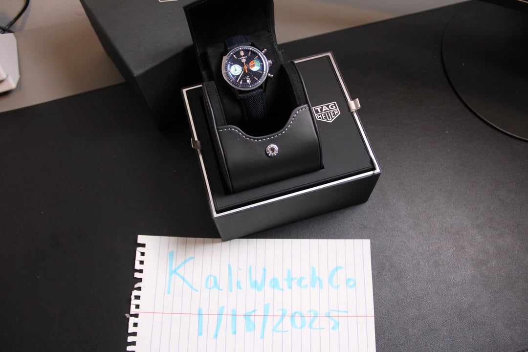 Tag Carrera Chronograph Skipper Complete Set (Open card) Ref: CBS2213.FN6002 Scope of delivery: Complete set with box, booklets, warranty card (open), and travel case. Condition: Watch is in excellent condition overall with hairlines on clasp. Specifications: 39 mm case size on blue fabric strap with see-through caseback. Automatic in-house movement with 80 hour power reserve TH20-06. Price: 4️⃣4️⃣0️⃣0️⃣ + shipping Retail: $6,900 + tax Instagram: KaliWatchCo Based in Bucks County, Pennsylvania. Plenty of references available on all platforms. Wire or Zelle for payment. All Pennsylvania Residents are subject to sales tax without a resale certification.