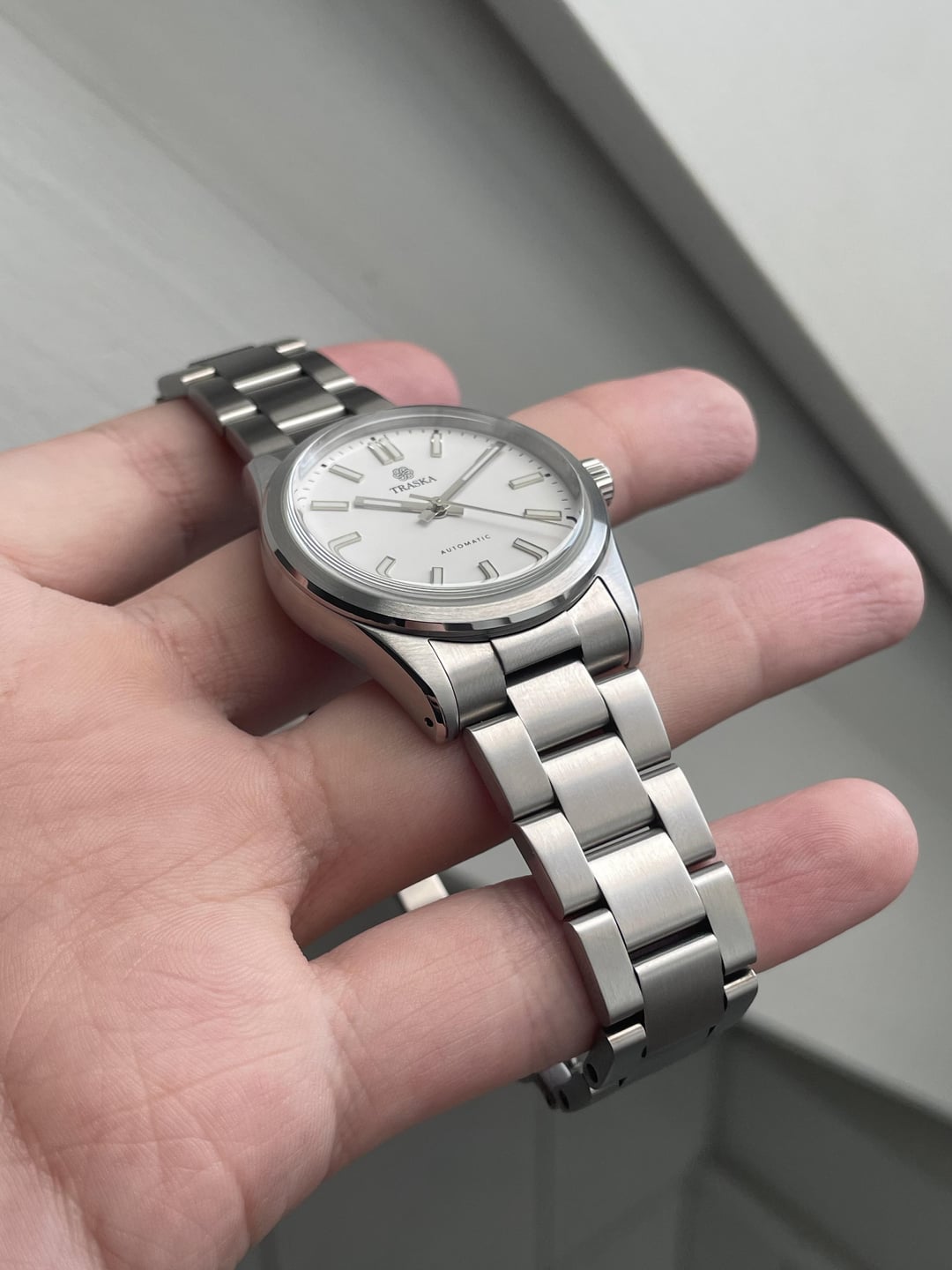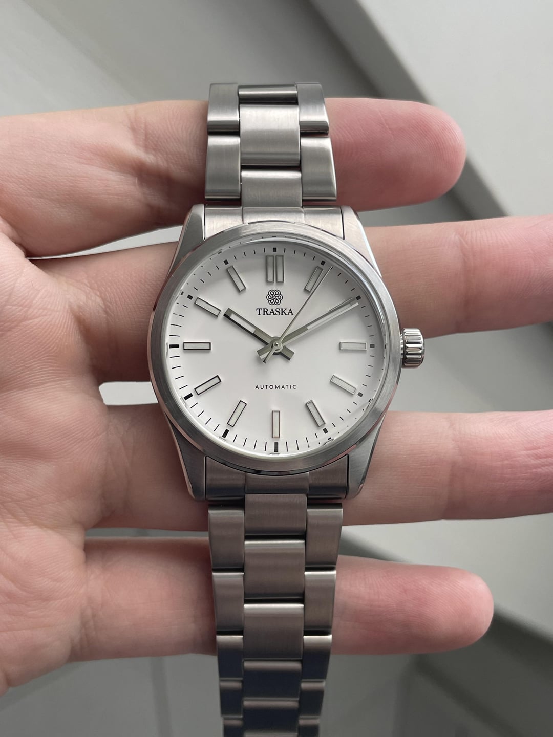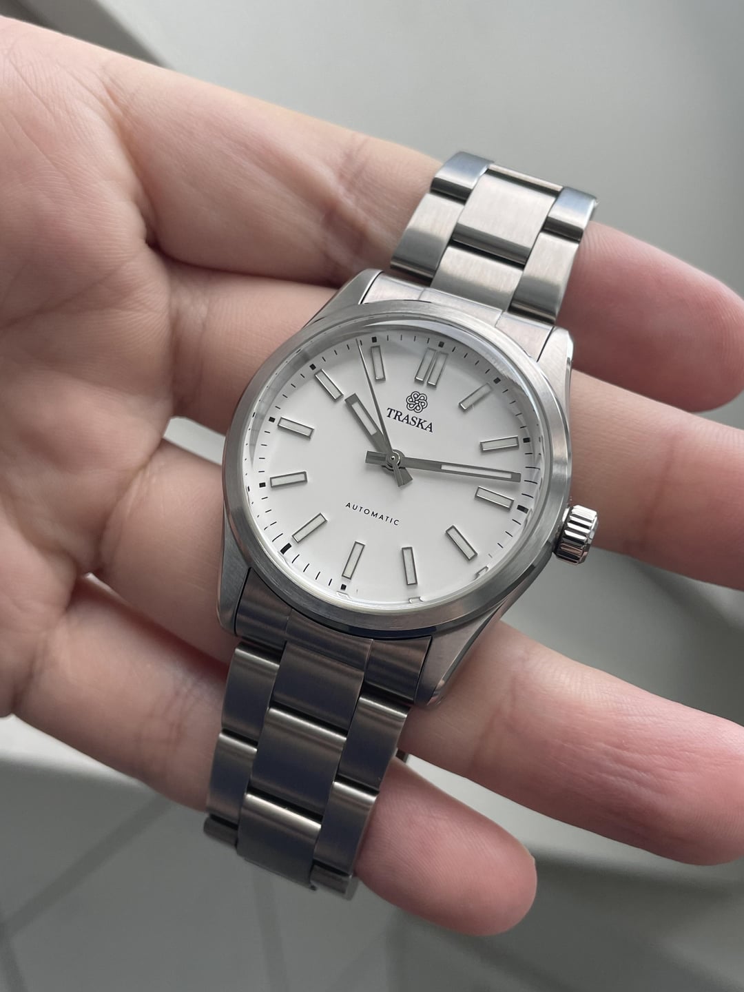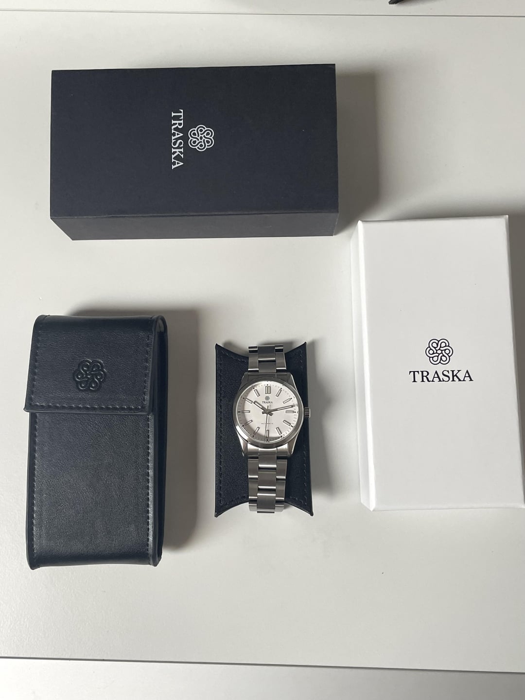 Hi all! Here for sale is this Traska Commuter 36 Gen 2. Dial: A pure white, called „Arctic White“ by Traska Size: 36.5mm Movement: Miyota 9039 (automatic, 28800 bph) WR: 100m Crystal: Sapphire with AR Condition: (Very) good Comes with box, travel pouch, extra links Sold out on the Traska website Price: $469 with shipping included! Shipping worldwide from Switzerland. No trades atm. Payment: Wise, IBAN, crypto [Timestamp](https://imgur.com/a/oF7yU2t)