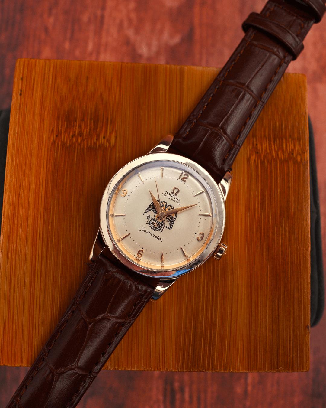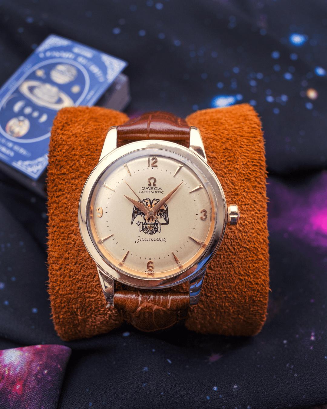 An ultra rare Omega Seamaster vintage watch in good condition. White satin finished sunburst dial with golden raised faceted indexes. Masonic Double Eagle signed dial, the emblem has developed to have a desirable warm yellow color which makes it rather gorgeous and goes well with the overall gold tone of the watch. It's a very limited and pretty much one of a kind on the market and I've not seen any other. 14k Gold filled case. The gold color has retained well all over. Comes with an aftermarket brown leather strap with unsigned buckle. Creative design on the piece, makes it a conversation piece. In an era of inflated prices of modern sports watches, this is a bargain. A classic. The build quality is very high end overall. It has the legendary Bumper half rotor movement. Omega signed crown. Movement has been serviced. Great time keeping. Amazing condition, ready to be used as a daily driver. Such pieces should be appreciated upfront to experience at full measure, Pictures don't do justice to this beauty. There’s a small dent on caseback. Omega is renowned to produce watches such as this, simple time only minimalistic clean dial watches yet sophisticated and complex movements. It is a design language that goes through centuries and yet appreciated. Great collectible. PRICE: $849 USD via Paypal, Zelle, Venmo, Cashapp, TransferWise, Wire, Crypto. FREE 5 day DHL Shipping worldwide. Considering a full service has been done to the watch, I'm asking a reasonable price. I have a good number of exchanges here for a safe transaction. A great investment watch, specially in this condition. Check my Instagram: [https://instagram.com/hour.lust](https://instagram.com/hour.lust) * Manufacturing Year: 1954 * Caseback Reference: G6250 * Case size: 34.5 mm (w/crown) * Lug to lug size: 43 mm * Case thickness: 10.5 mm * Caliber 354 Automatic In house Bumper Movement Pics: [https://imgur.com/a/gtr9tY1](https://imgur.com/a/gtr9tY1) TS: [https://imgur.com/a/7R4DRs8](https://imgur.com/a/7R4DRs8)