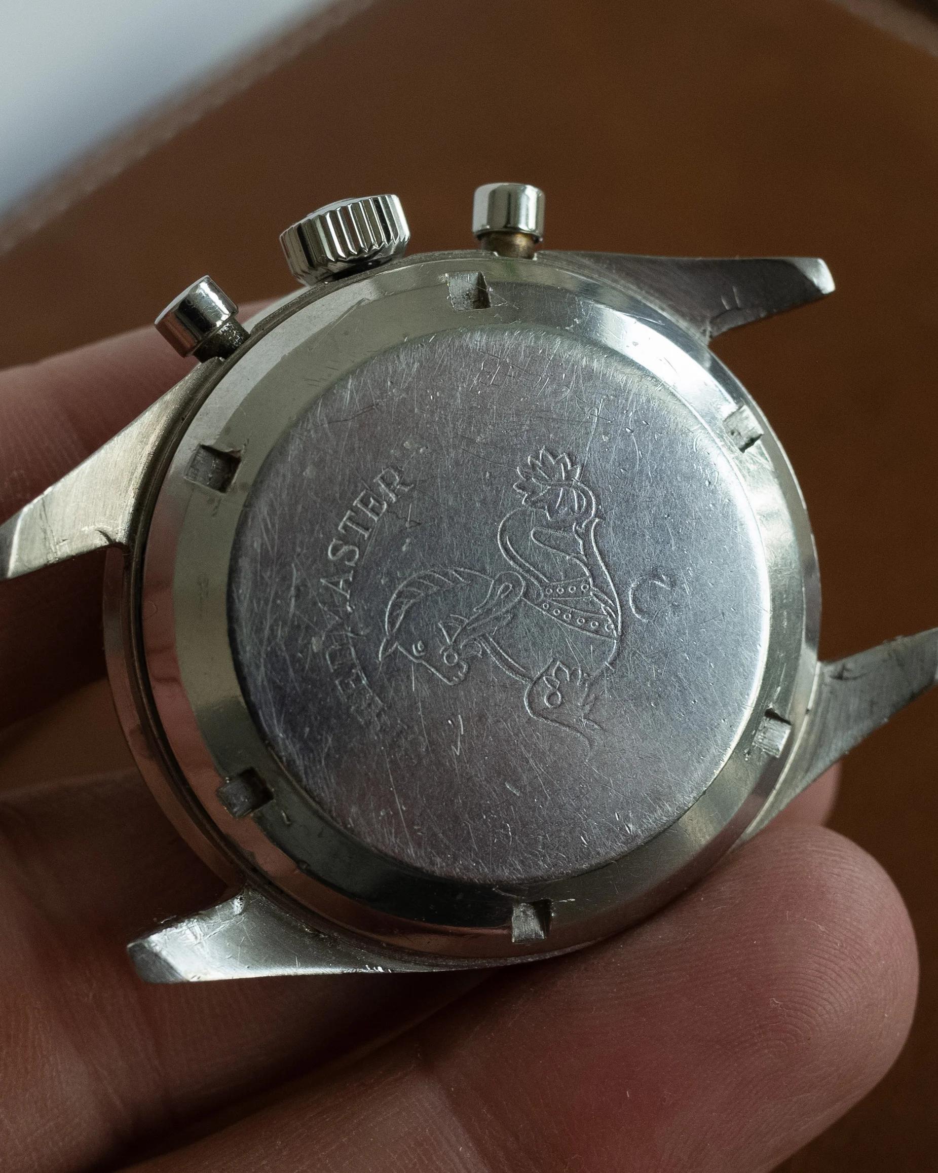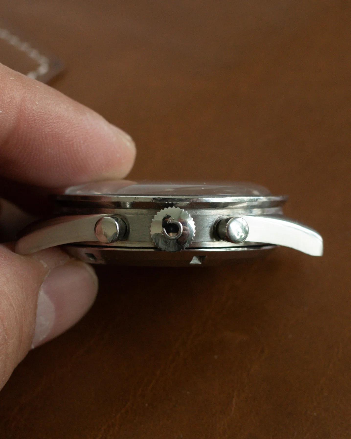 Dial: Correct dial has been relumed in the past, presumably during a service in the 60s, since the tritium no longer reacts. I think it actually looks very nice and has a pleasant tone. Original alpha hands and correct drop chrono hand have been relumed in the past.