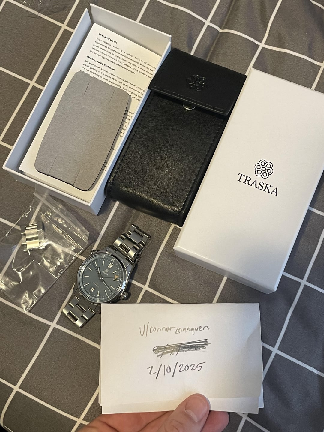Up for sale is barely used Traska Venturer GMT with the Steel Blue dial. This is one of the latest models with the screwn-down crown at the 10 o’clock position. Also has the micro adjust bracelet clasp. Sale includes the box, Traska travel pouch, and additional links. The watch is practically new and has rarely been worn. Traska is definitely one of the best micro-brands and are known for their scratch resistant coating which is incredible, and this watch still shines and looks new. These watches were out of stock for some time but were recently restocked so I’m pricing aggresively to sell. Here’s your chance to save on a practically new watch. Asking $599 Shipped CONUS via PayPal F&F or Wire. Thanks for looking! Message me with any questions.