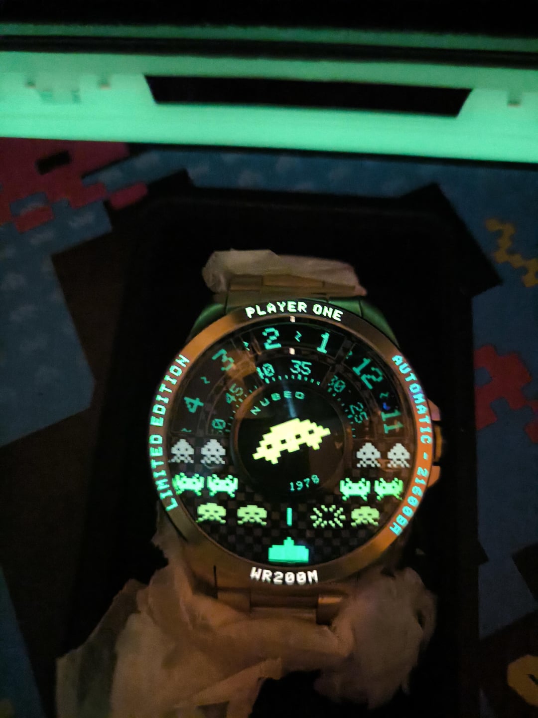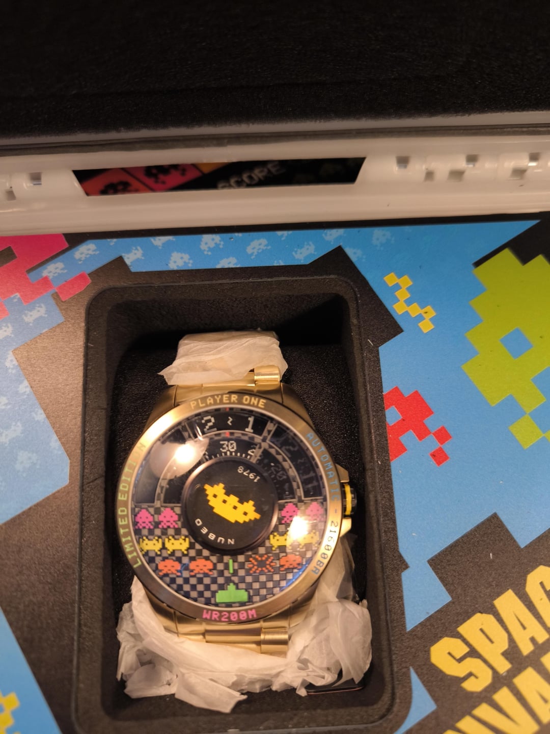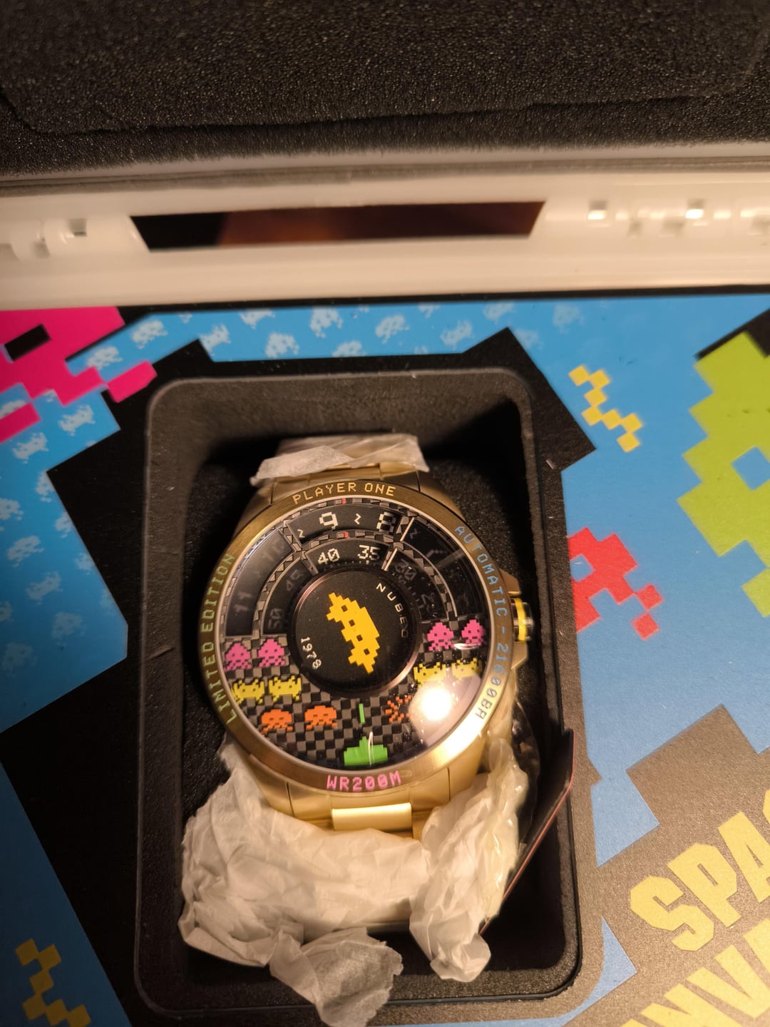 Nubeo x Taito 45th anniversary of Space Invaders collab, Automatic Limited Edition 005-150 Voyager Gold 48mm ref: NB-6082-SI-33 - $500 New and unworn limited edition numbered No. 5 out of 150! This came about as a limited release for the 45th anniversary of 1978 Space Invaders between Taito and Nubeo. The watch comes with the full kit (and glow in the dark case) and the plastic protective film still there for the future owner to unwrap. Shipping worldwide with T&T+Signature for delivery, Items will be packaged with extreme care. Payment through PayPal Friends and Family and G & S (+4.6%) for anyone with at least 1 review/transaction here.