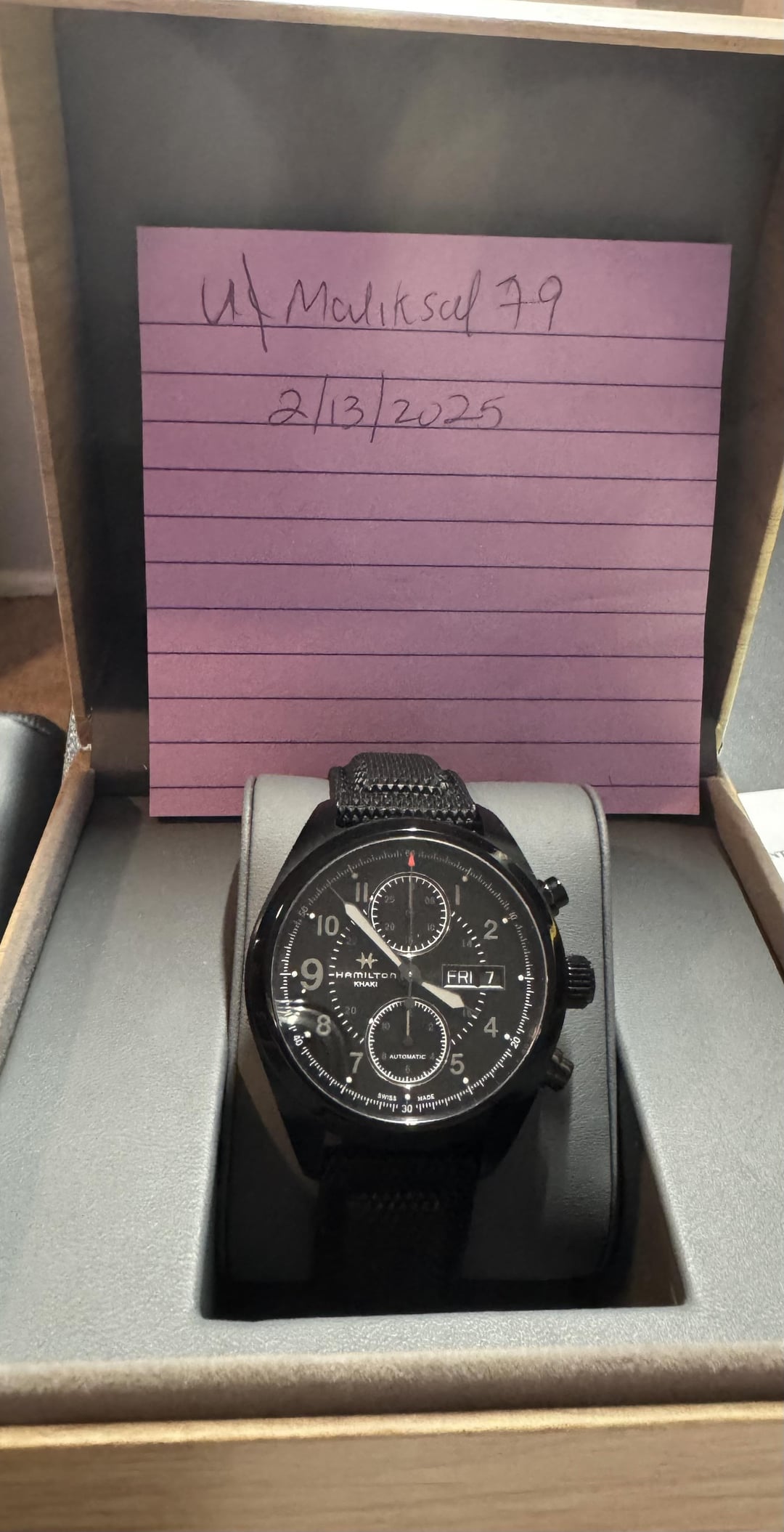 For sale is my Hamilton Khaki Field Day Date 42mm. Watch comes with full kit. Watch is in great condition and runs great. Open to trade up with cash from me. Under warranty until 12/2026. Please let me know if you have any questions. Please comment first below messaging. MSRP $1895.00 https://www.hamiltonwatch.com/en-int/h71626735-khaki-field-auto-chrono.html Asking for $900 OBO. Shipping included CONUS. I will accept Zelle, Venmo and Paypal (buyer covers fees). Timestamp in photos Specifications Reference: H71626735 Caliber: H-21 Collection: Khaki Field Movement: Automatic Case size: 42mm Thickness (mm): 14.5 Dial color: Black Case material: Stainless steel Coating: PVD black Crystal: Sapphire Lug width: 20mm Power reserve: 60 hour Water Resistance: 10 bar (100m)/145 psi (328ft) Anti Reflection: Yes Open Case Back: Yes Screw Down Crown: Yes