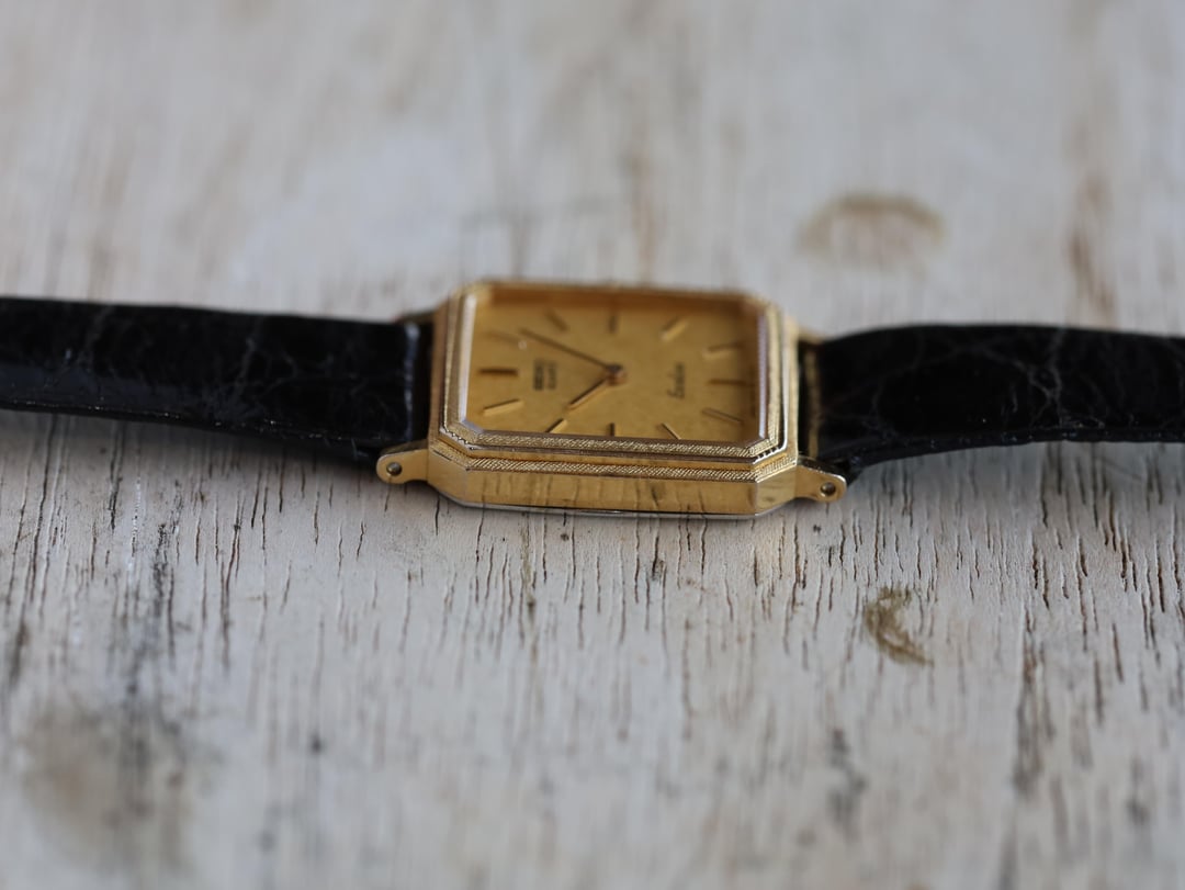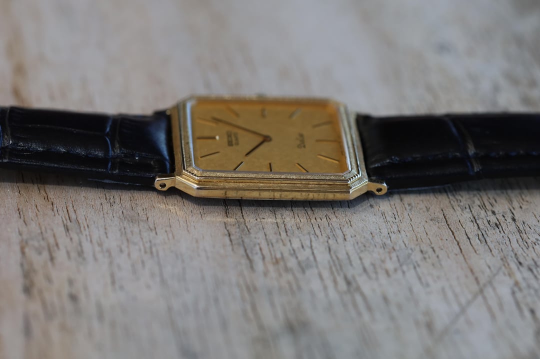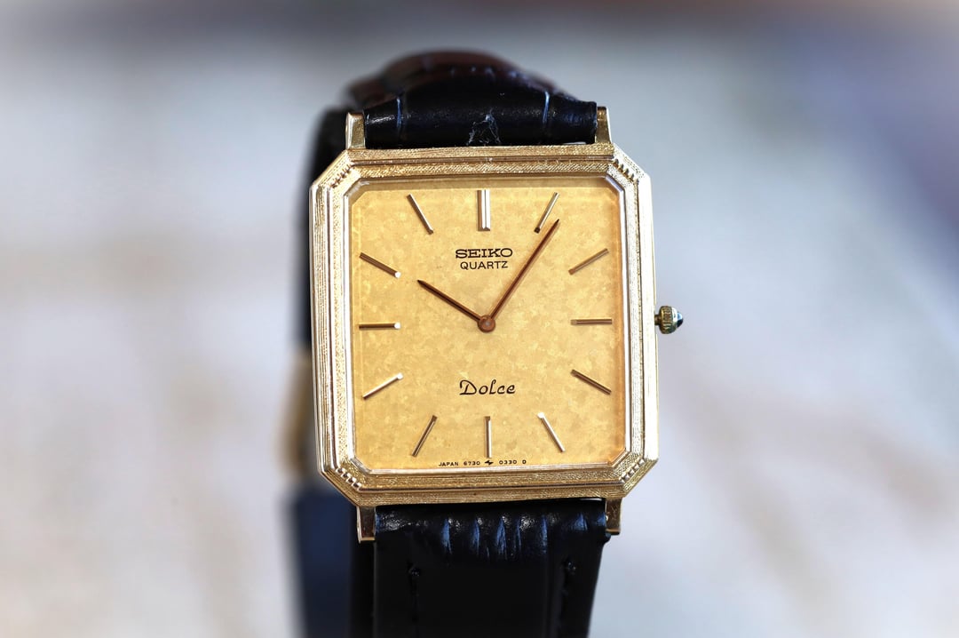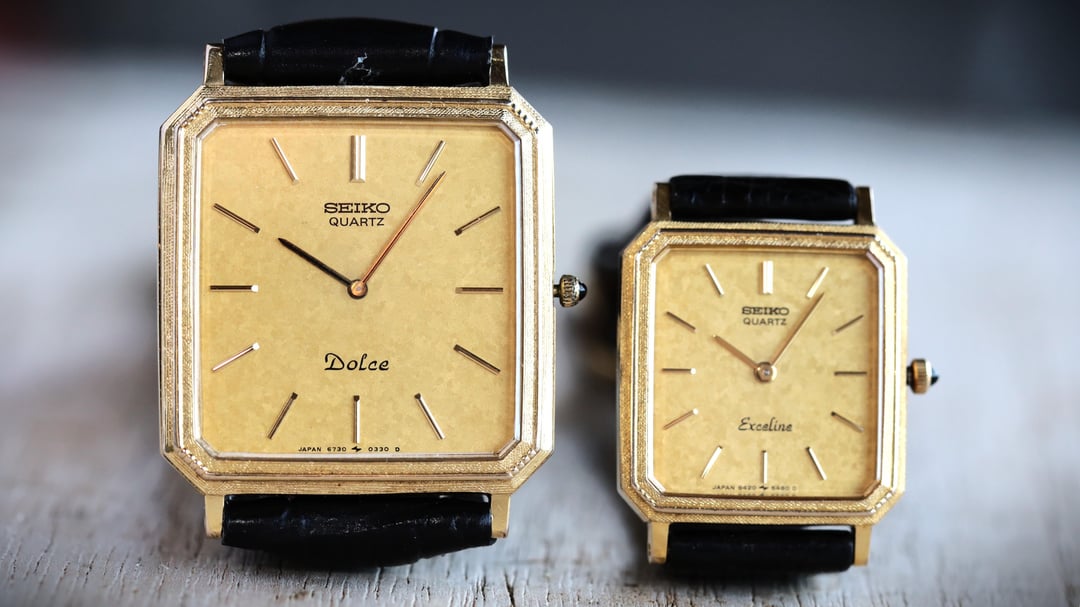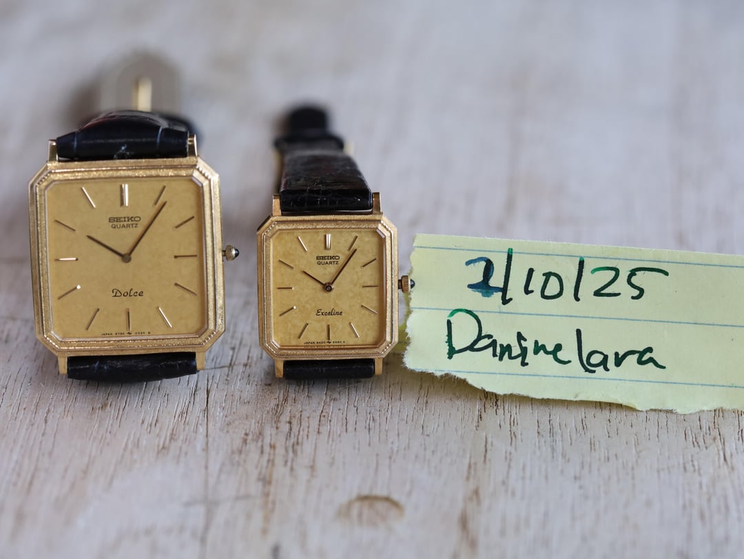 Greetings watch-people Today I'm offering a his and hers pair of solid gold Seikos. These feature an art-deco design. Both watches offer a timeless duo of his and hers timepieces, showcasing the perfect blend of style, craftsmanship, and precision. **Shared Features:** Tank-styled design in excellent condition 10k solid gold case, a rarity for Seiko watches Beautiful Champagne dial with an intricate pattern Onyx Crown adds sophistication Sapphire crystal for durability and scratch resistance Genuine leather strap for a luxurious touch Super thin profile: Dolce - 3.8mm, Exceline - 4.4mm Exclusively "MADE IN JAPAN" for the JDM market **Seiko Dolce Watch:** 6730 movement with +-15 seconds per year accuracy **Seiko Exceline Watch:** 8420 movement with +-15 seconds per year accuracy **Dimensions\~** ***Dolce:*** 27.4mm without crown 34mm lug to lug 3.7 mm height 18 between lugs. ***Exceline:*** 20mm without crown 36.4mm lug to lug 4.4 mm height 13mm between lugs. **Overall Condition:** These are vintage and pre-owned. Excellent condition. They are keeping great time and all functions work as they should **Case and bezel:** Excellent unpolished condition. **leather strap and buckle**: The exceline comes with a worn original Exceline branded band and buckle. The Dolce comes with an unworn genuine leather strap **Crystal:** Sapphire Crystal is flawless. **What’s included:** watches only. No box, no papers. **ALBUM**: up there ☝🏻 **TIMESTAMP**: [https://imgur.com/aozsIo0](https://imgur.com/aozsIo0) **VIDEO ON IG:** [https://www.instagram.com/reel/DGEF3VJycMV/?utm\_source=ig\_web\_copy\_link&igsh=MzRlODBiNWFlZA==](https://www.instagram.com/reel/DGEF3VJycMV/?utm_source=ig_web_copy_link&igsh=MzRlODBiNWFlZA==) **$599 NET TO ME SHIPPED. NO TRADES.** **Zelle preferred but Paypal FF accepted as well.** **Free shipping within the USA.** I ship from Los Angeles to the USA with USPS priority mail with insurance. I will ship the watch within 2 business days after payment. **Reference and reputation as a seller:** BUY THE SELLER! I have completed HUNDREDS of transactions here and at different watch forums. Deal with confidence. Check out WUS & REDDIT feedback & reputation. **I’m always happy to answer any of your questions.** **Note:** Photos and videos are my own and of the actual watch. I encourage all buyers to be sure of the watch you are buying prior to purchase. I will honor returns within 24 hours of receiving only if the product is not working properly. I do not accept returns for “Buyer’s Remorse”