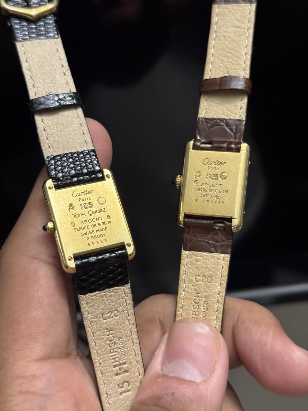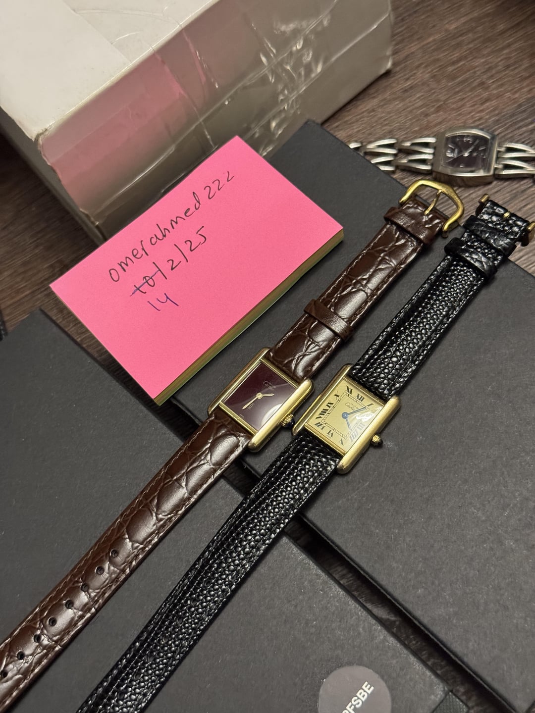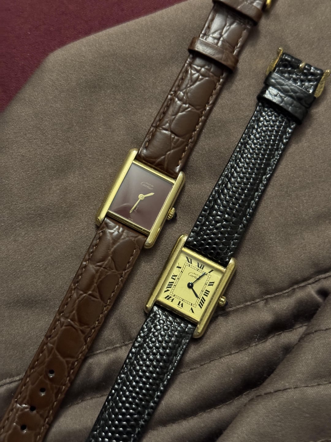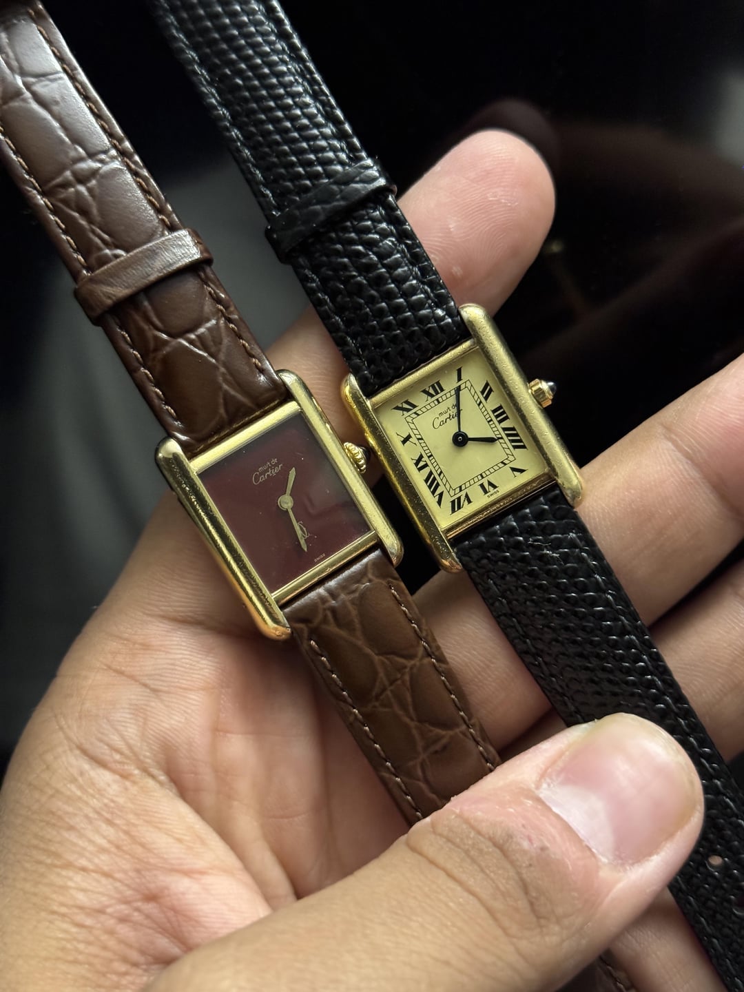 Must de Cartier tank Burgundy dial with some spidering on it, gold plated 925 case. Manual winding movement. Good condition overall. Am strap with OG buckle 1400$ Tank quartz champagne Roman dial Some signs of wear. Quartz movement. Am strap with OG buckle. 1200$ Payment through wise / Zelle / usdt Conus fedex shipping