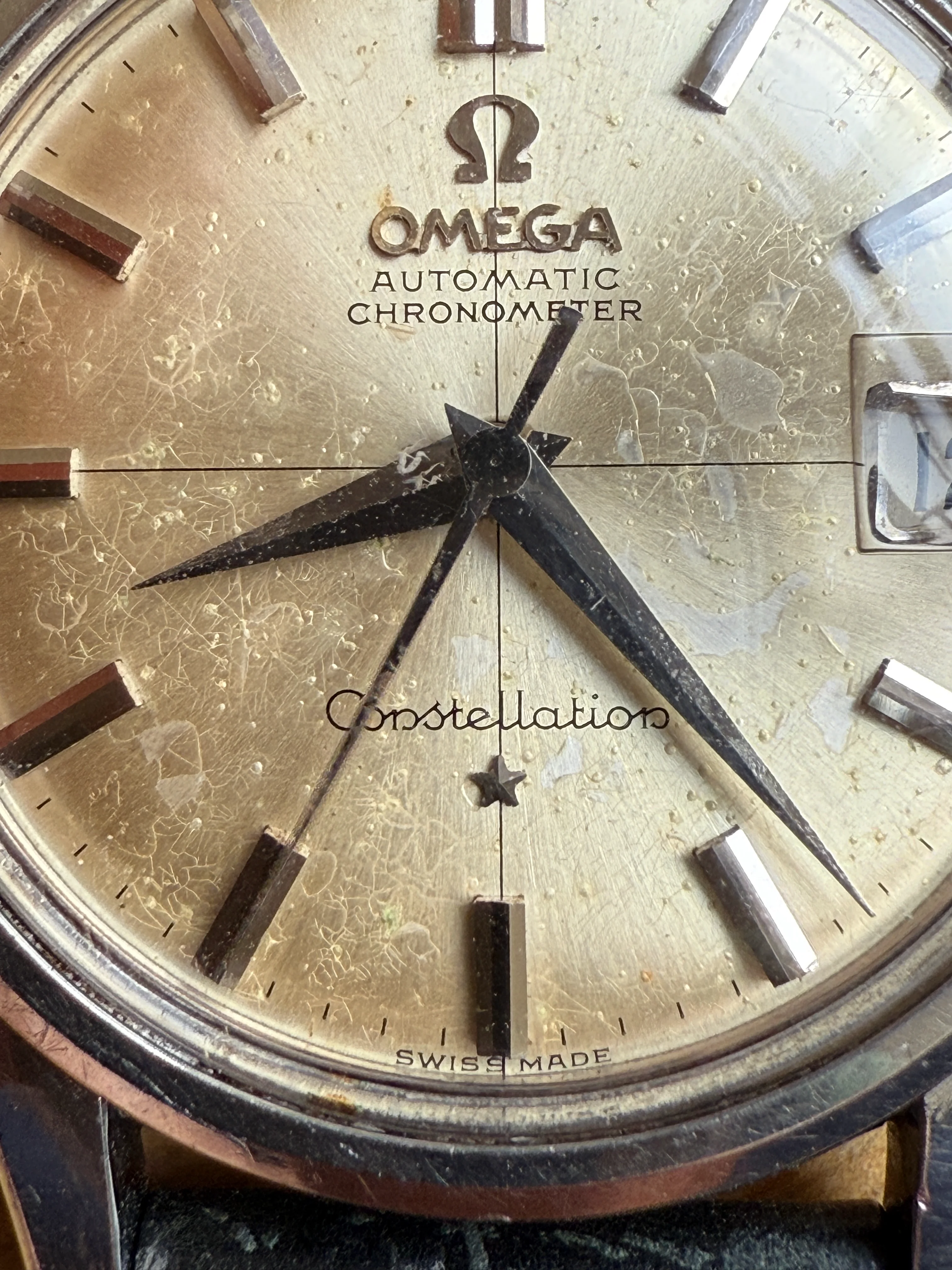 A stainless steel Omega Constellation 14393, 34.5mm, damaged original champagne cross-hair sunburst dial.