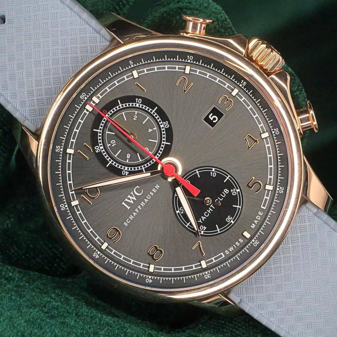 Up for sale is IWC Portugese Yacht Club Chronograph in Grey Dial. Inspired by maritime and nautical themes, this timepiece highlights its connection to the yachting world, designed specifically for sailing and water sports enthusiasts. Encased in 18k gold, the Yacht Club chronograph features a large grey dial adorned with rose gold Arabic numerals. The red seconds hand stands out vividly against the black sub-dials, ensuring easy tracking while also adding a bold pop of color to the dial. Presents itself in mint condition with little to no signs of wear. Features a sleek, polished slim bezel that subtly enhances the luxurious appeal of the grey dial. The beautiful brushed case offers a commanding presence on the wrist, while the exhibition caseback showcases the mechanical power of the piece. Functions include hours, minutes, seconds, date, and chronograph counters. The minute hand and date wheel can be adjusted using the screw-down crown on the right side of the watch. It also features luminous hour markers and hands that allow you to read the time even in total darkness. Comes as a full set, double-boxed, including the watch pillow, warranty card, warranty booklet, Yacht Club chronograph booklet, and an extra black rubber strap. Its connection to the world of yachting and water sports ensures that this chronograph is not only an accessory but a tool for those whose lives revolve around these high-energy pursuits. And even if you’re not sailing the high seas just yet, at least you’ll look like you are – while keeping perfect time for your next meeting or weekend getaway! Please excuse any dust, fur, reflections, or any other hard-to-avoid elements in the photos. We can take additional photos or videos upon request. Price: $13,928.00 shipped overnight fully insured with signature required to your nearest FedEx Office for hold/pick up. [TIMESTAMP](https://imgur.com/lfwCV4q) [PICS](https://imgur.com/a/S5aaW9f) Call/Txt: 626-699-3488 Email: [[email protected]](mailto:[email protected]) Looking for this watch on a different strap or a very similar variation of this watch? Send us a message and ask us! We are stocked with straps/bracelets and get new inventory everyday! How have we achieved 5 Star Ratings and 100% Feedback across all platforms? Experience the Majestix Difference: We will give you a video tour of the watch over a live video call or we can record one for you. This ensures that we have the watch in hand, ready to ship. We video record the packing process for every watch that we ship so you know exactly what to expect when you open your package. Also because insurance requires the video recording in case anything happens to the package and they need to pay out for missing / stolen packages. We send you the video recording so you know exactly what to expect when you receive the package. Check our reviews and/or ask for references regarding our quick and excellent service. High value timepieces shouldn't be shipped any slower than priority overnight. We ship priority over night via FedEx. Every package is fully insured with signature required to a FedEx Office of your choice within the continental USA. International shipping may be available depending on which timepiece you buy and which country you want it shipped to. Different countries have different maximum insurance values. Please message to be sure we can ship to your international location (insurance only covers to specific countries). We are always open to trades. Message us with possible trade-ins!