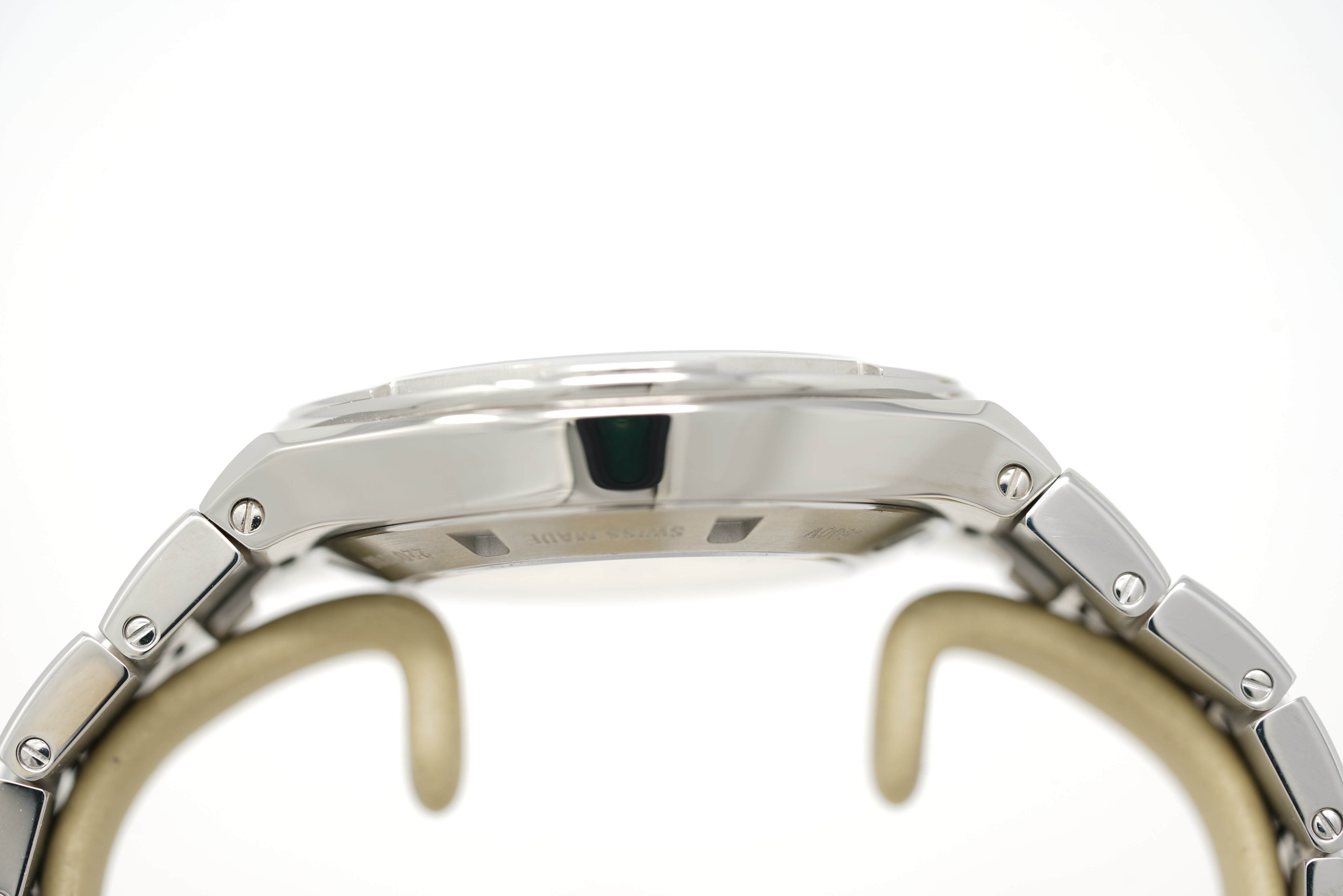 This pre-owned watch is in 94% condition due to faint marks on the sides and back of the case. The bracelet is in 94% condition due to faint marks on a few of the links. The bracelet will accommodate a wrist size up to 6 and 1/2 inches. Originally purchased in September 2023, this watch comes with its inner and outer box, instruction manual, warranty card, hangtag, and the one-year Topper Pre-Owned Select warranty.