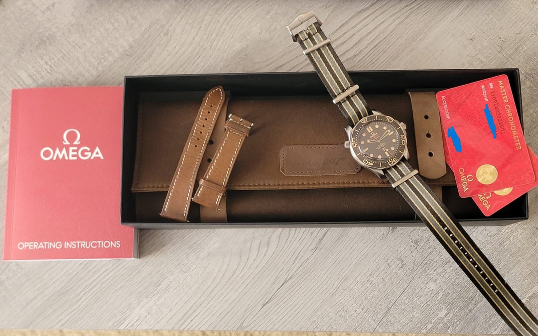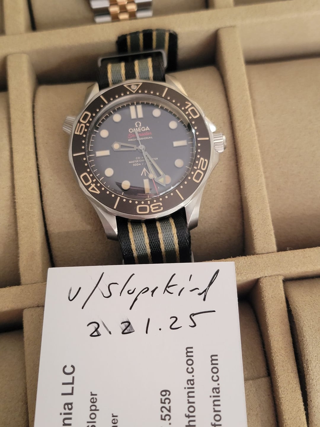 Omega Bond Seamaster NTTD Ref: 210.92.42.20.01.001 This watch is in great shape with limit wear throughout. It will come with double box, Bond travel case, booklet, 2 picto cards (missing warranty one), extra aftermarket brown strap and buckle. It is running superb on the timeographer as shown in the photos. Price = $6,250 shipped Pics & Timestamp = [https://imgur.com/a/Iwb4fat](https://imgur.com/a/Iwb4fat) IG = watchfornia Cheers, Adam
