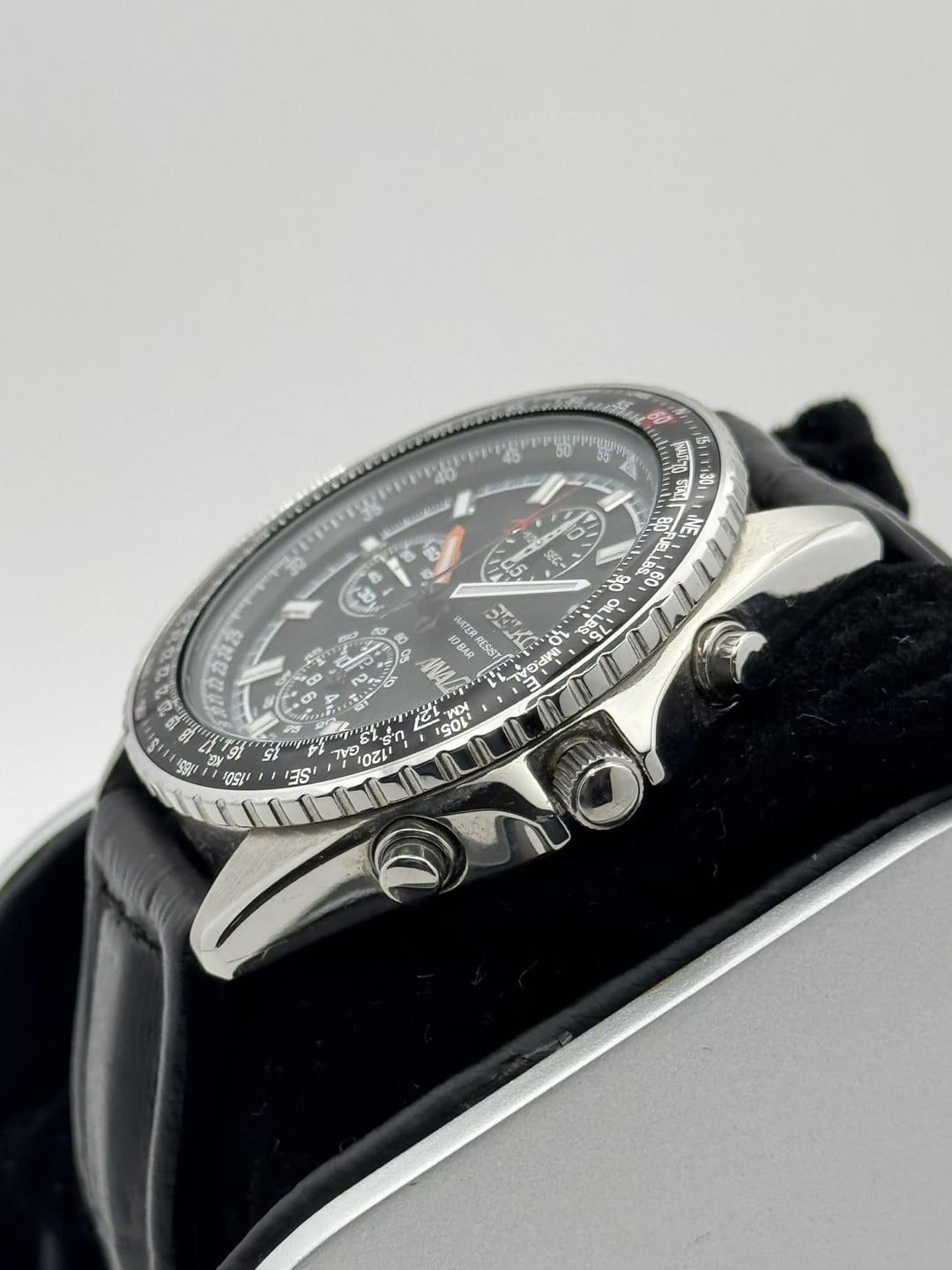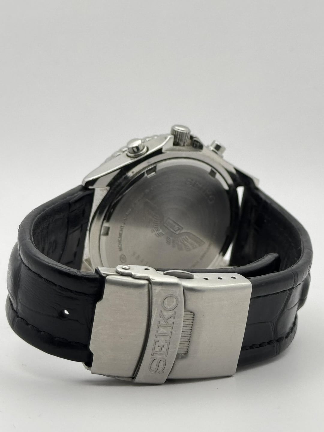 Hi everyone, Up for sale is a Seiko Flightmaster 7T92-0CF0 Quartz Chronograph in excellent condition with original leather strap. Fully functional chronograph and date display. A must-have for aviation enthusiasts. Here is everything you need to know: Model History: The Seiko Flightmaster series is renowned for its aviation-inspired design and functionality. The 7T92-0CF0 model, part of this esteemed collection, combines precision with a robust chronograph feature, making it a favorite among pilots and watch enthusiasts alike. Powered by the Seiko 7T92 quartz movement, this timepiece offers reliability and accuracy, hallmarks of Seiko's watchmaking excellence. Specifications: * Reference Number: 7T92-0CF0 * Movement: Seiko 7T92 Quartz Chronograph * Case Material: Stainless Steel * Case Diameter: 43 mm (including crown) * Lug Width: 19 mm * Dial: Black with matching subdials * Crystal: Original, scratch-free * Strap: Original leather strap in excellent condition * Additional Features: Chronograph function, date display Condition: This Seiko Flightmaster 7T92-0CF0 is in exceptional condition. The crystal is free from scratches, and the case shows minimal signs of wear. The original leather strap and signed buckle are well-preserved. All functions, including the chronograph, operate flawlessly. Please note, the watch is sold without the original box and papers. Shipping is from Budapest, Hungary insured. Price: $245 per PayPal F&F (or G&S +5%). If you're interested or have any questions, please don't hesitate to reach out to me. Thanks for considering this timeless piece, and happy collecting!