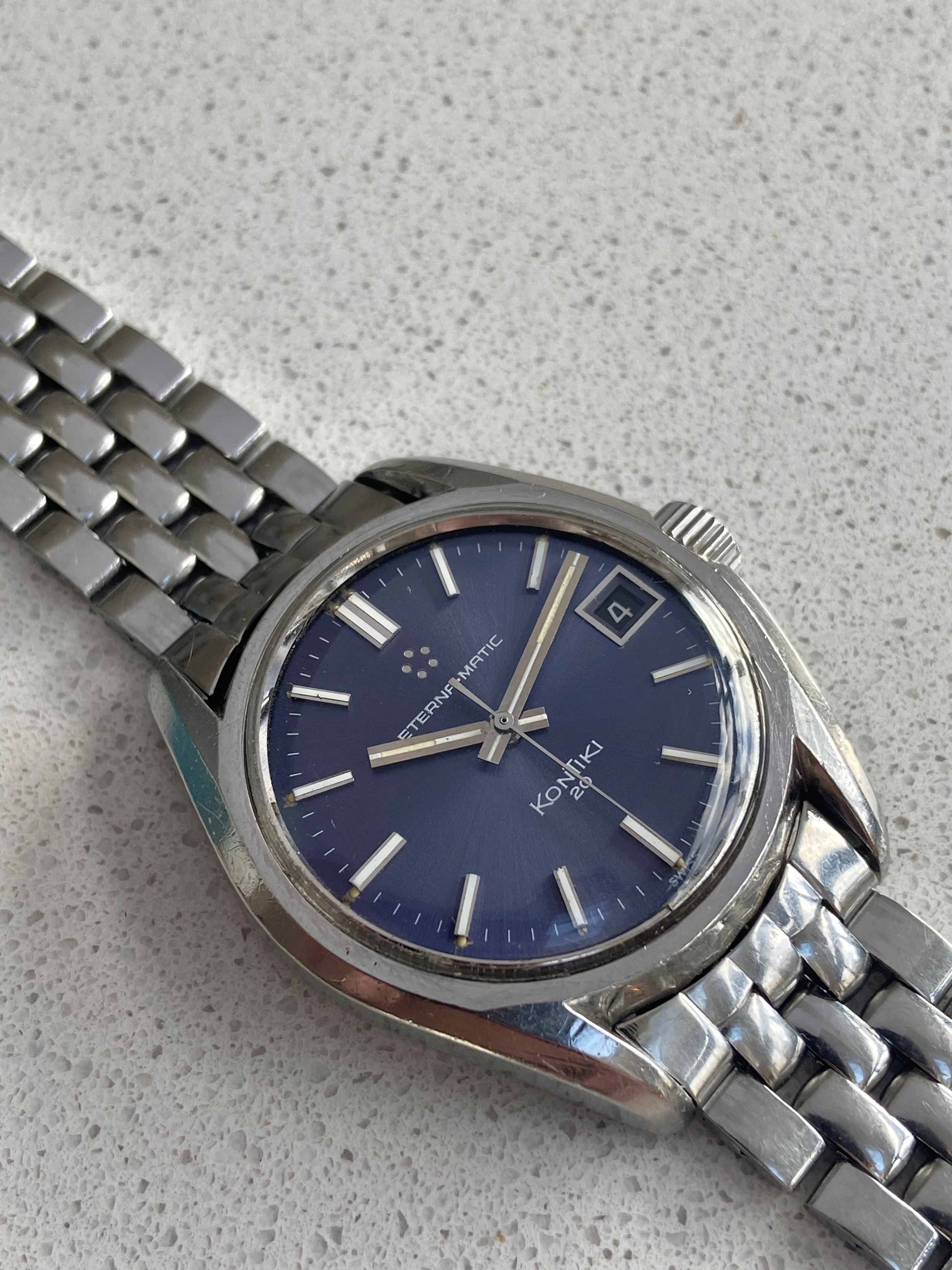 Offering for sale my Eterna Matic Kontiki 20 with beautiful blue sunburst dial, 37mm case, box and Gay Freres bracelet.