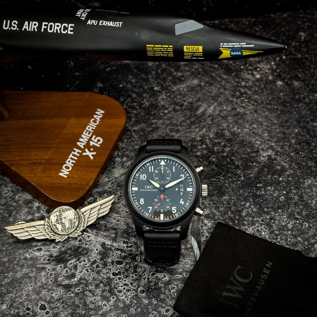 **IWC Pilot's Watch Chronograph "Top Gun" 46mm** *Active In-House Warranty through 2026* Reference: **IW388001** *Case: Full Ceramic* *Strap: Black Cordura* \- Condition: Excellent. **Asking:** $5750 + shipping (FedEx Insured) *-* MSRP: $11,900 + tax. \- Full Album: [https://www.dropbox.com/scl/fo/76fmad0qaf28vs90y4t8t/ANHX04nflvtBrvQ9CeIKQPw?rlkey=eibyp903cymfsieyxgsgo33n7&st=60vv507s&dl=0](https://www.dropbox.com/scl/fo/76fmad0qaf28vs90y4t8t/ANHX04nflvtBrvQ9CeIKQPw?rlkey=eibyp903cymfsieyxgsgo33n7&st=60vv507s&dl=0) Timestamp: [https://www.dropbox.com/scl/fi/3vwzftef9yyqd9adtqvb8/IMG\_2178.JPG?rlkey=cvla8l3u0xfjsdkhqg6shl5l2&st=utj85344&dl=0](https://www.dropbox.com/scl/fi/3vwzftef9yyqd9adtqvb8/IMG_2178.JPG?rlkey=cvla8l3u0xfjsdkhqg6shl5l2&st=utj85344&dl=0) *-* This Pilot's Watch Chronograph features split-second accuracy making it an indispensable item in any pilot's watch collection. The calibre-89365 chronograph movement features a 68-hour power reserve. The soft-iron inner case protects the precision movement against magnetism. The dial is in the classic cockpit-style design, all the way down to the dat3 display, which closely resembles an altimeter. Luminescent white hands and displays ensure outstanding legibility, even when visibility is poor. \- Includes outer box, inner box, manuals and a 1 year warranty from SkyCloud Luxe on the movement. Missing original warranty card but watch was verified with IWC as authentic. Letter from IWC available upon request. Serial number also valid in MyIWC. \- Watch is excellent condition showing very little signs of wear in the case and bezel. Ceramic is free of chips. Crystal and AR coating are mint. This watch has been tested thoroughly on a timegrapher and is running to COSC standards and is not in need of service. Timegrapher shot available upon request. \- *Ask as many questions as you'd like before purchasing. Facetime appointments welcome.* *-* Wire or Zelle preferred. Credit cards accepted with strong references. Add 3.5%. Ships from Denver, CO. We are new to reddit but not new to selling watches. Please look us up. Tons of deals done and references available upon request.