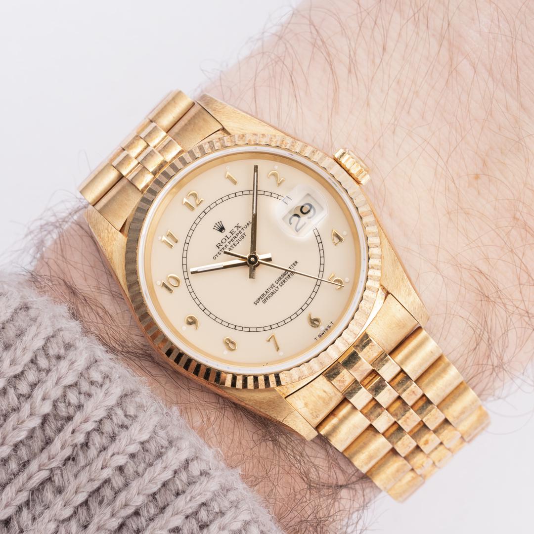 **Model**: 16238 **Condition**: Very Good (vintage unpolished) **Year**: 1994 **Scope**: Box & Papers **Movement**: Automatic, Serviced 2025 **Case Width**: 36mm **Strap Length**: 7.75" **Listing ID**: 220001720 **Price**: $19,850 Shipped Overnight. Payment via Bank Wire. [Album](https://imgur.com/a/1VaVyxC) | [Timestamp](https://imgur.com/OXAMcnB) **Our Take** The Rolex Datejust Reference 16238, crafted from 18K yellow gold in a 36mm case and bracelet, originally retailed for $18,500 in the 1990s—equivalent to approximately $38,000 today. This particular example features a rare and seldom-seen "ivory cream" boiler dial, elegantly accented with 18K gold indices. Completing the look, the 18K yellow gold bracelet is fitted with a concealed clasp, seamlessly integrating with the iconic coronet for a refined and effortless closure. A rare opportunity to acquire the 16238 with this exceptional boiler dial, this piece stands as a true collector’s gem. This Rolex Datejust Reference 16238 is in good pre-owned condition, remaining entirely original. We have chosen to leave it unpolished, preserving its authenticity for the next owner, though a complimentary polishing can be provided upon request to restore a like-new appearance. The rare cream boiler dial is in outstanding condition, featuring perfectly matched tritium lume plots alongside 18K gold hands. The movement has been fully cleaned and serviced, backed by a 2-year mechanical warranty for reliable performance. The bracelet is currently sized for wrists up to 7.75", with additional links available upon request. This timepiece comes complete with its original inner and outer box, original papers dated 1994, and a service card.