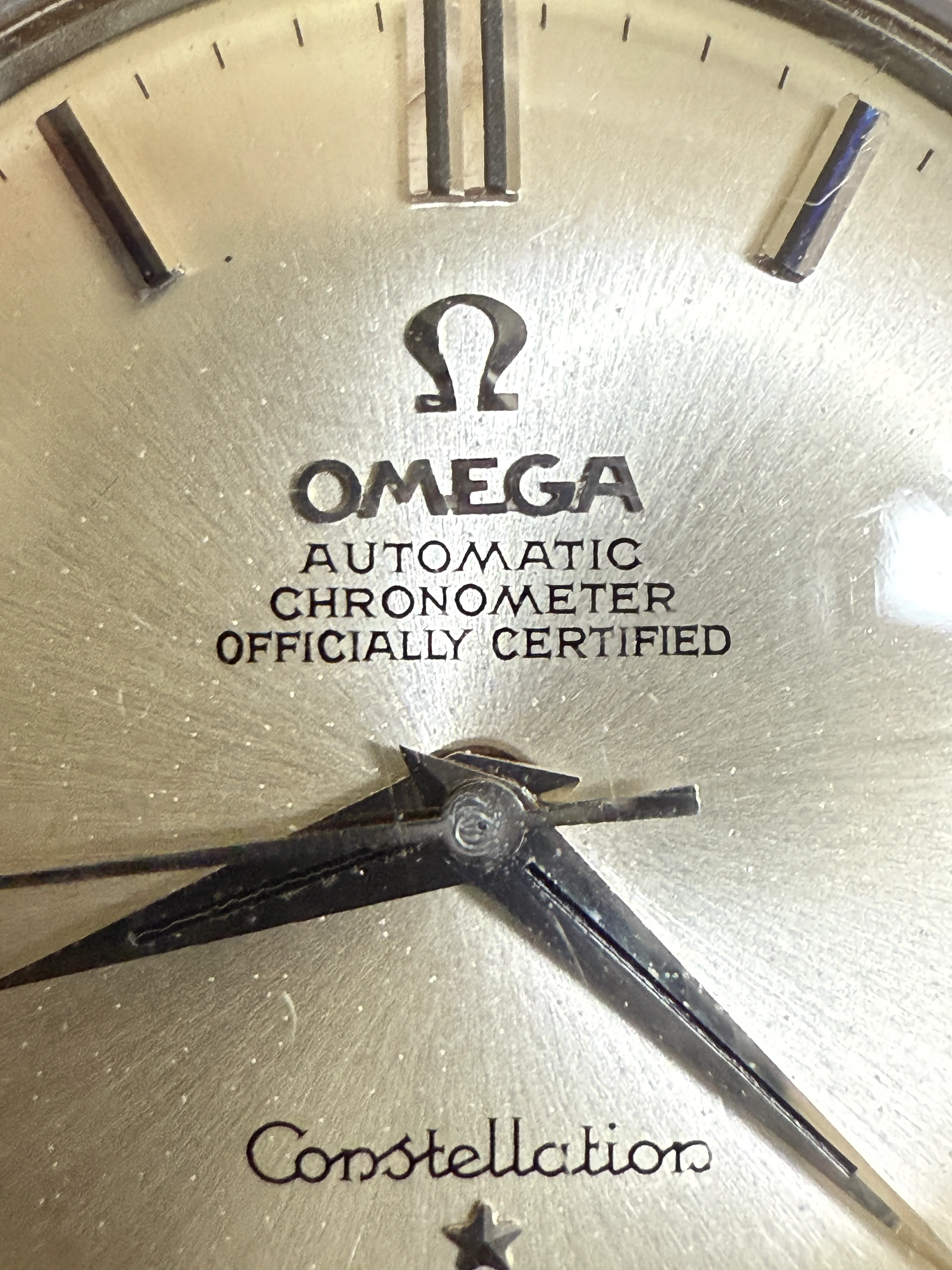 A stainless steel Omega Constellation Dog leg 168.005 in very good condition, 34.5mm, original silver sunburst domed dial.