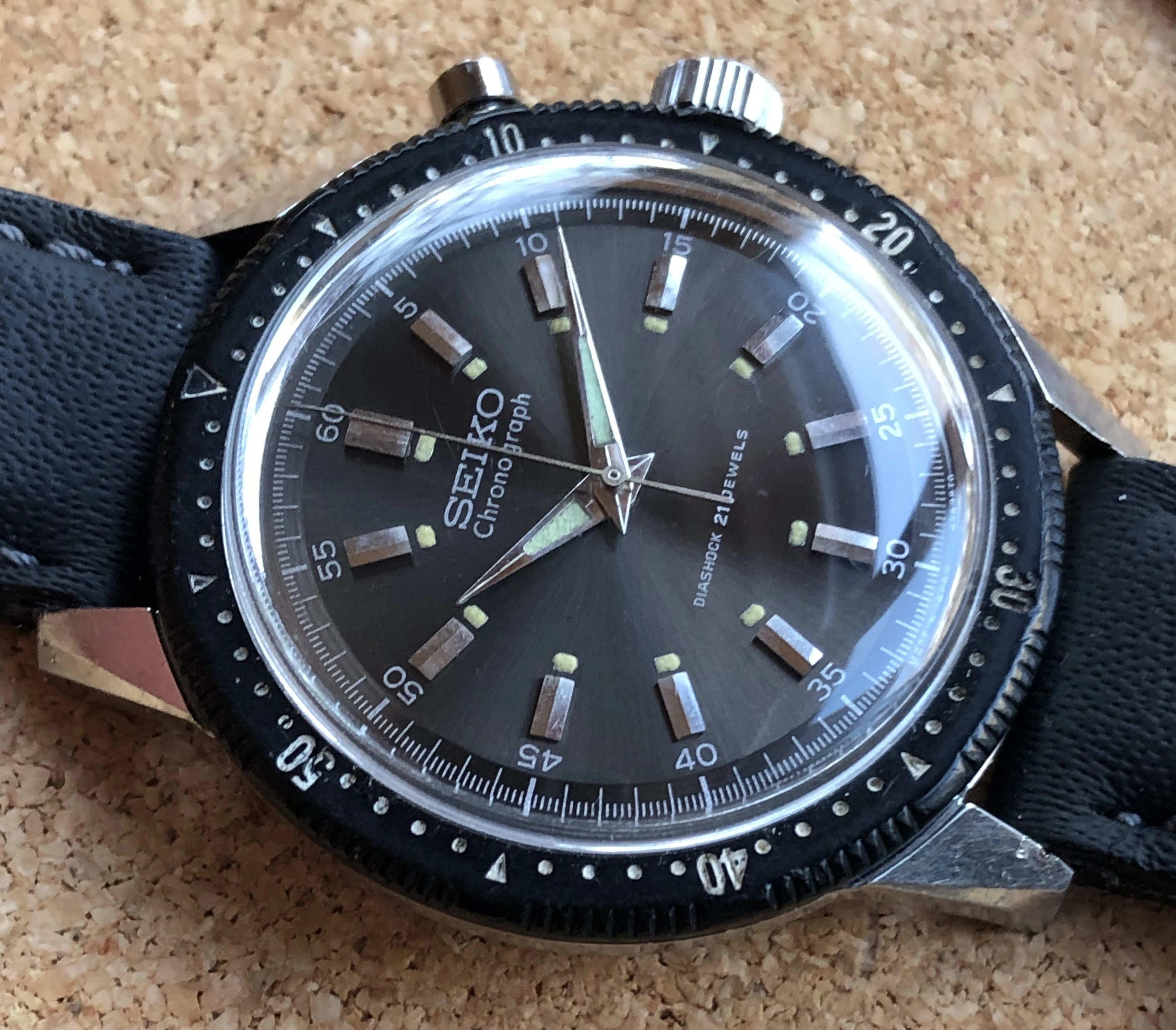 For sale is a 1964 ref 45899 hand-winding Seiko monopusher chronograph. This was Seiko's first chronograph, released for the 1964 Tokyo Olympics with the Olympic torch on the back. This is a very good example IMO, with a beautiful sunburst charcoal dial and clean lume plots and hands. Notably, the watch retains its original intact bakelite bezel (rotating smoothly), which was often replaced during service with a stainless service part. The 37mm case is extremely sharp, showing detailed and prominent chamfers. The case-back shows wear that is typical for these shallowly engraved examples. I had the watch serviced in 2021 by Vintage Time Australia (Adrian Sellick) and it is winding, setting, and running.