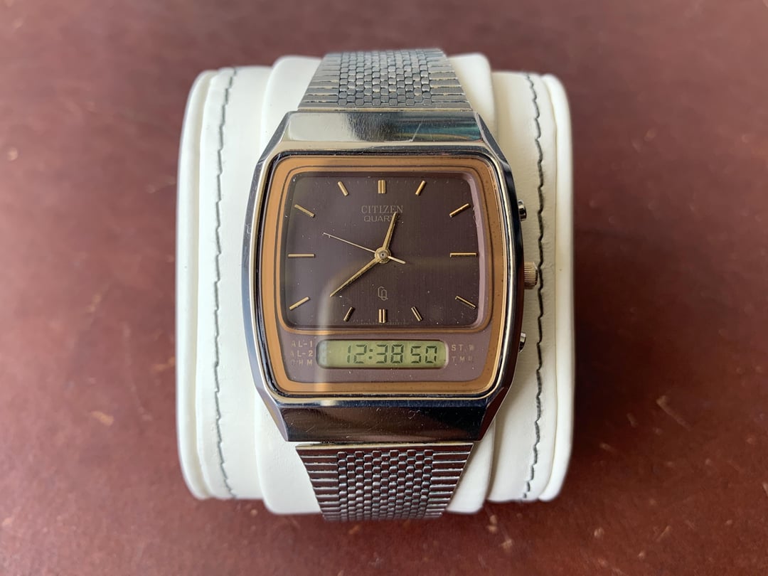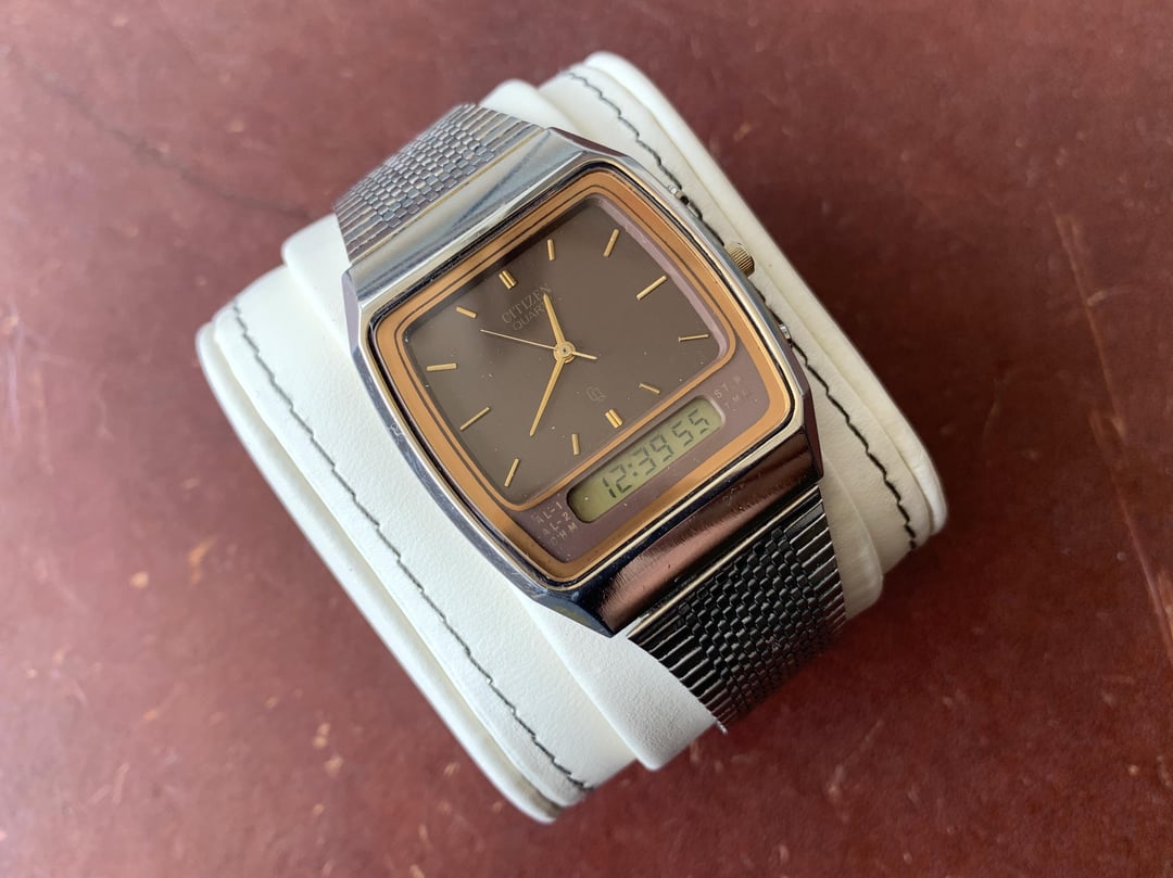Vintage Citizen 90s Analogue-Digital Watch 33x40mm, quartz, rare brown dial, bracelet is 18mm at the lugs widening to 22mm down to 15mm at the clasp, original piece with all functions working except the alarm. Overall, it’s in great condition (the battery was changed a few months ago). £250 GBP shipped within the UK (I’ll need to check shipping rates for int’l buyers). Payment through paypal. Let me know if you have any questions; the watch will be shipped from the UK.