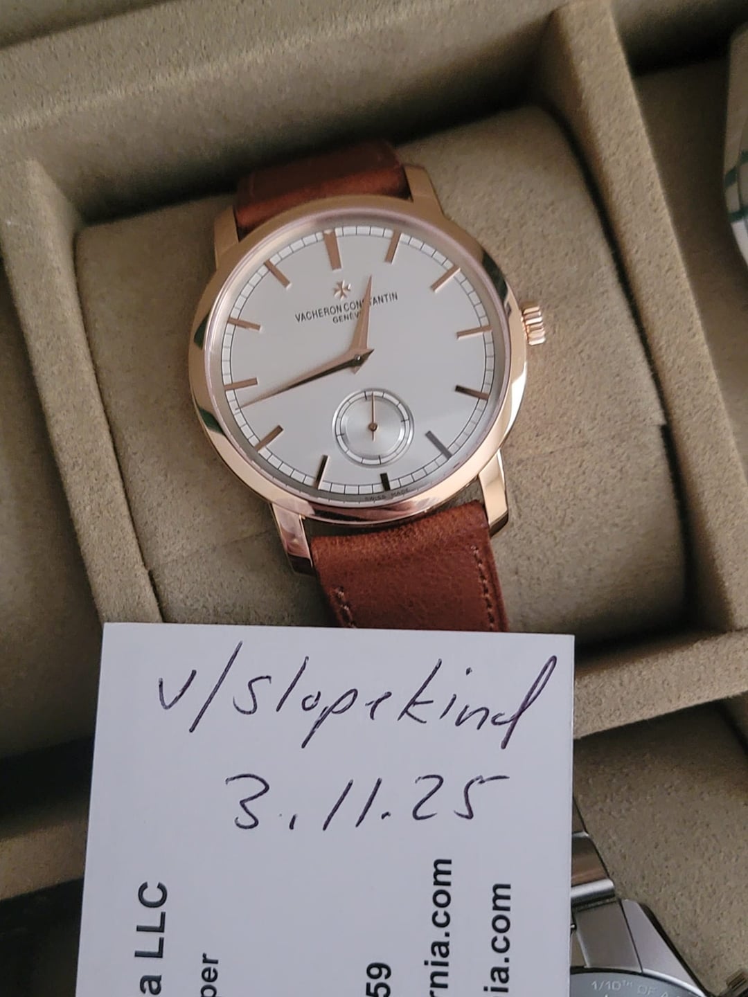 Vacheron Constantin Traditionnelle Manual-Winding Ref: 82172/000R-9382 38 mm Pink Gold This watch is in superb condition with very light wear shown. It was just fully serviced at VC which was requested by me. I requested the watch to not be polished as it only has very little signs of wear. Will come with service documents dated 3/2025, VC travel case, and aftermarket strap shown on the watch. Will also come with the OEM Pink Gold buckle. Retail $23.5k plus tax Price = $12,499 shipped Pics & Timestamp = [https://imgur.com/a/3oiNFke](https://imgur.com/a/3oiNFke) IG = watchfornia Cheers, Adam