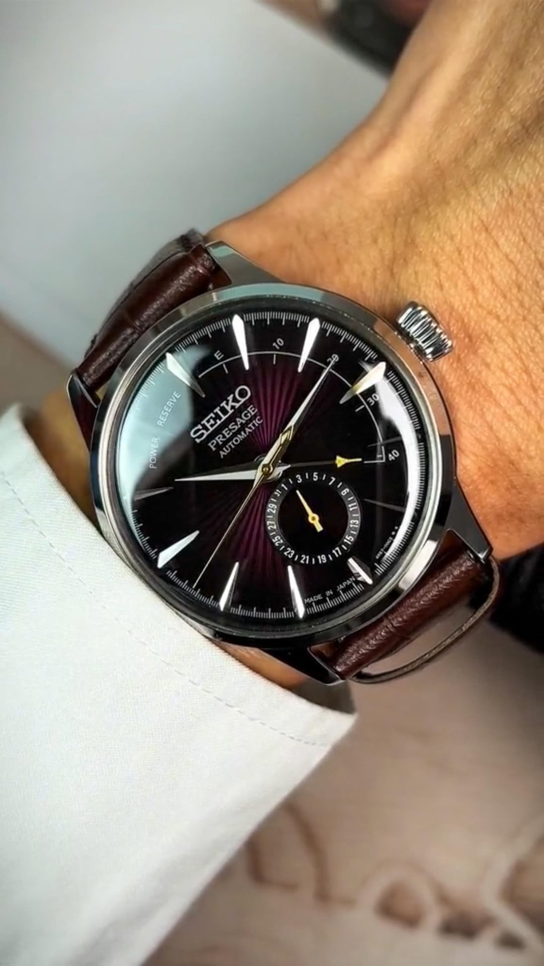 For sale is a **Seiko Presage Cocktail Time Black Cat Martini SSA393** in **excellent condition** - **Full kit**: Includes the original box, papers, and warranty valid until March 2027 - Stunning brown and purple dial with a sunray finish, creating a unique bird’s-eye view into a cocktail glass - Case Diameter: 40.5 mm | Lug to Lug: 47.5 mm | Lug Distance: 20 mm | Power Reserve: 41 hours | Movement: 4R57 - Worn less than **5 times**, in great condition overall - **Accurate performance**: Running at -0.3 seconds per day (average over the last 5 months) - Priced at **$435 + shipping**. PayPal or Venmo F&F only. - No trades please