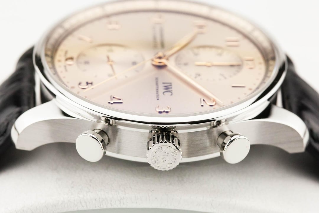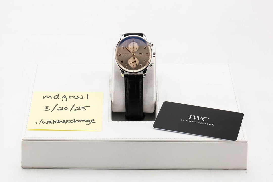 Up for sale is an unworn condition IWC Portuguese Chronograph 41mm Beige Dial on Leather, reference # IW371624. It comes complete with all boxes, papers, booklets, hang tag and IWC Warranty Card dated February 2025. Unworn Condition / Complete Set **Item Details:** IWC Portugieser Chronograph 41mm Stainless Steel Case In-House Calibre 69355 **Timestamp:** [https://live.staticflickr.com/65535/54399077776\_33856b9e45\_b.jpg](https://live.staticflickr.com/65535/54399077776_33856b9e45_b.jpg) **Trades:** We are cash buyers and will consider all modern trades. **Payment:** Listed Price is for Bank Wire, Zelle or any no-fee payment method. Paypal is an additional 3.5%. **Price:** $6995 - Shipped 2 Day Air ! **Shipping:** Fedex Express within the US. International Shipping adds $150. **Returns:** Returns accepted within 48 hours of receipt only if the watch is misrepresented. **Contact:** Please email or text for fastest response. [[email protected]](mailto:[email protected]) or call / text 207-209-4000 Buying a watch on the internet can be scary. We know. You want an established business, accurate presentation of product, followed up by quick responses, and expedited shipping. We understand. That is why we deliver this along with honest, straightforward transactions backed by our well-built reputation. We are new to Reddit but have been selling on forums for many years, and have literally thousands of references. All photography is original. 6.625% state sales tax applies to New Jersey shipping addresses only.