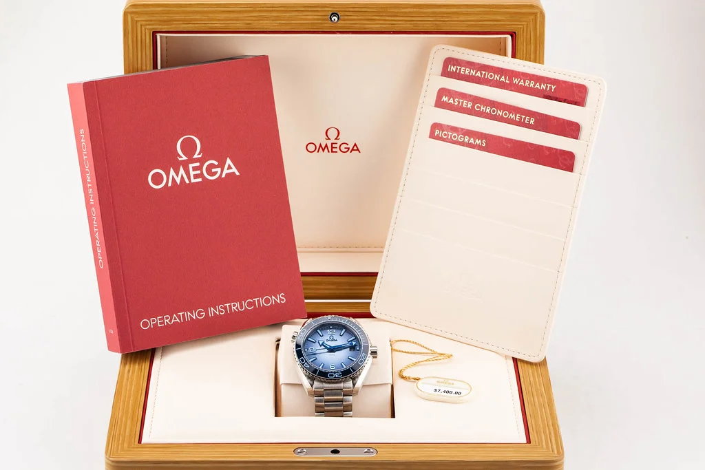 Up for sale is a brand new Omega Planet Ocean 600M 75th Anniversary 39.5mm Summer Blue Dial on Bracelet, reference # 215.30.40.20.03.002. It comes complete with all boxes, papers, booklets, hang tag and Omega Warranty Card dated March 2025.
